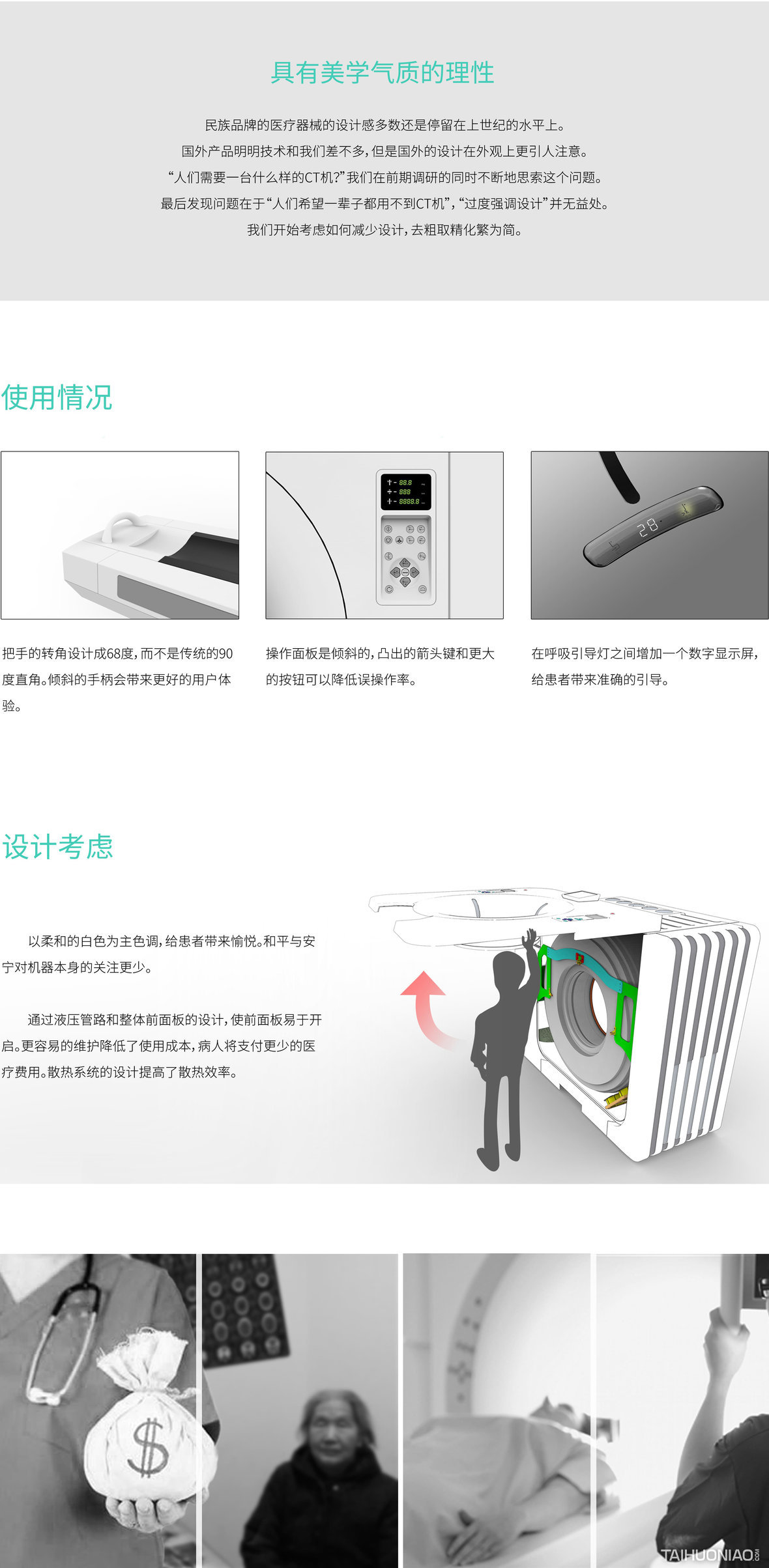 设计背景:医疗器械的设计和普通产品设计是不一样的,它的用户是非常特殊的人群,他们期待的是更好的医疗服务而已。那这设计一定应该满足医生的使用体验,满足患者的服务需求,成为医生患者的交流平台,默默无闻地为人们服务。解决方案:明峰CT的设计方案充分遵循了“美学气质的理性”这一设计原则,如CT机的侧面采用由上而下的贯穿“瀑布流”,除了探索性的体现家族设计DNA,功能上也能增强结构强度,并且降低装配的难度。