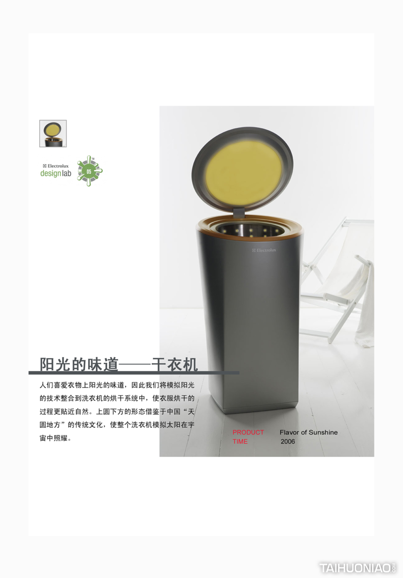 人们喜爱衣物上阳光的味道,因此我们将模拟阳光 的技术整合到洗衣机的烘干系统中,使衣服烘干的、 过程更贴近自然。上圆下方的形态借鉴于中国“天 圆地方”的传统文化,使整个洗衣机模拟太阳在宇 宙中照耀。
