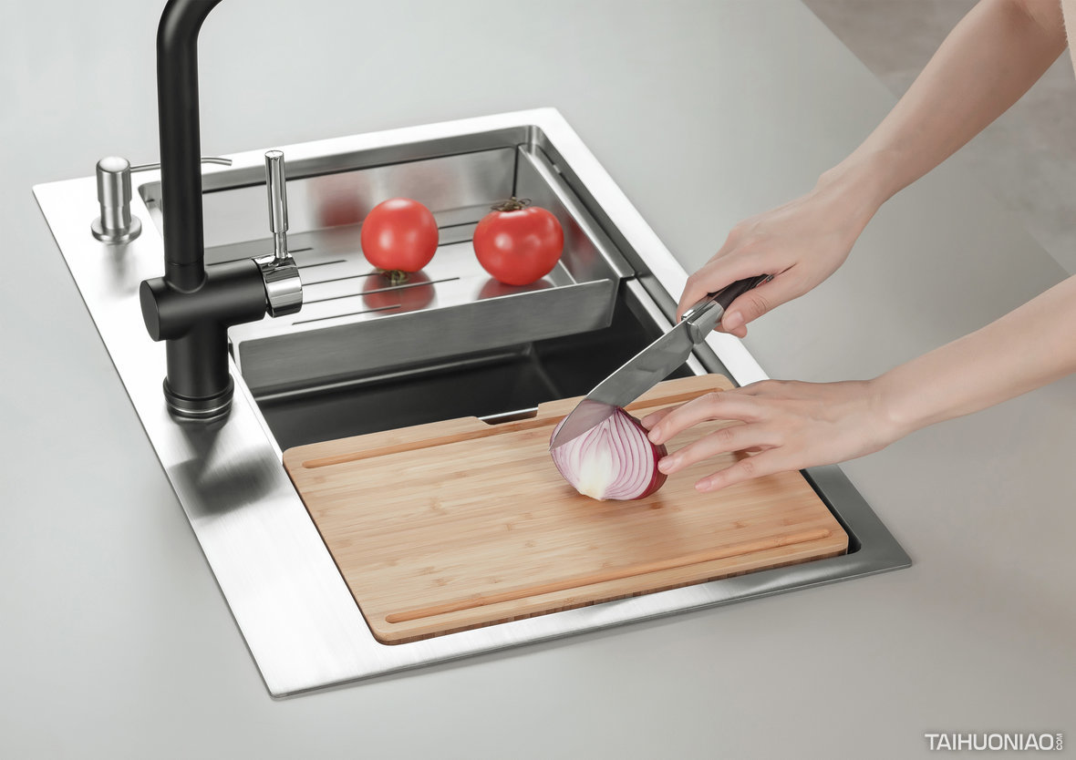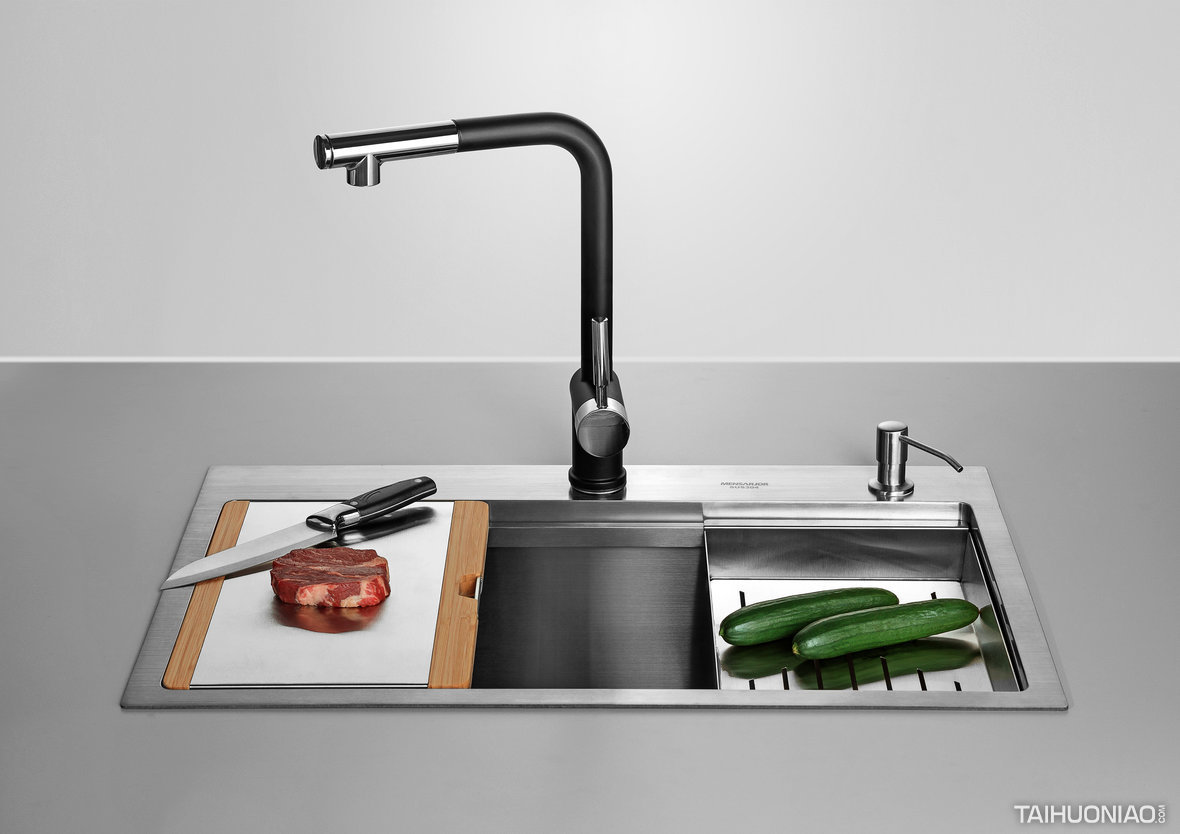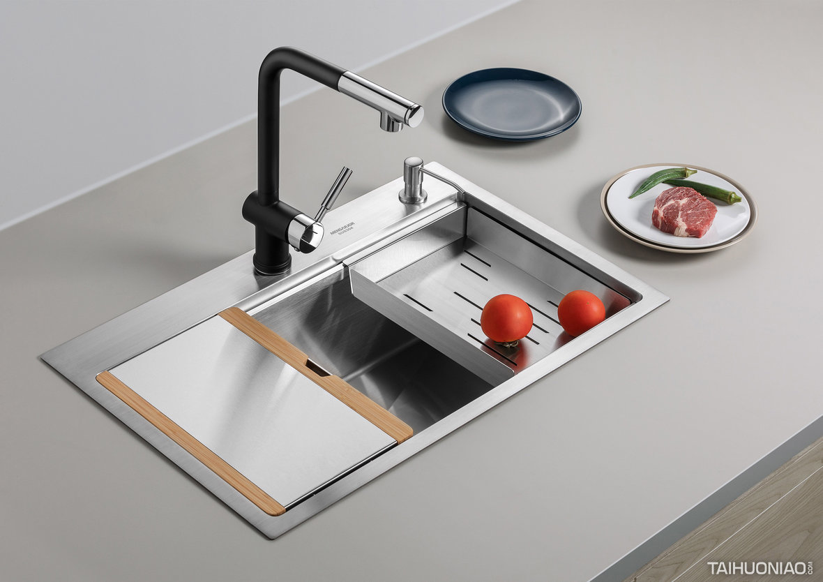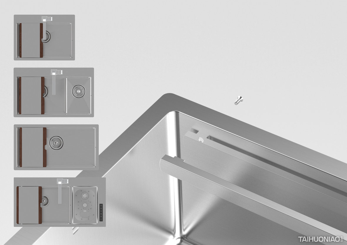 客户为专业手工水槽制造商。产品制造工艺限制很高。原来的产品和市场上的产品差异化不大。紧靠产品品质难以取胜。多功能型的水槽为最新的消费趋势。单一的水槽无法满足新一代年轻人的使用需求。水槽,菜板,沥水篮,水龙头做为一个烹饪预处理的系统性产品尤为重要。手工焊接水槽相较于拉伸水槽制造成带有台阶的水槽是非常困难的。如何设计全新的台阶方式成为完成整体系统的关键所在。 通过折弯焊接和抛光来生产台阶是异常困难的,我们在水槽内两侧增加拉杆,实现台阶功能。降低了制造工艺的难度。拉杆通过螺丝固定在水槽内侧立面。砧板、沥水篮等作为模块根据用户的需求应用在水槽上。砧板,双面设计,对应不同的食材进行处理,保障食材安全。砧板直接在水槽内使用,水渍垃圾都收纳在水槽内,方便用户处理食材的同时保持台面的整洁。砧板收纳在水槽内的一侧,砧板上的水渍在水槽内排走。用户也可以增加沥水篮,过滤过多的水分和解冻食材。砧板和沥水篮放在拉杆上,这两个模块随意切换不影响水槽使用。 外观+结构设计,设计周期2个月,2019年获得德国红点奖,小米众筹金额1024万,2019年双11,小米优品销量排行第一。