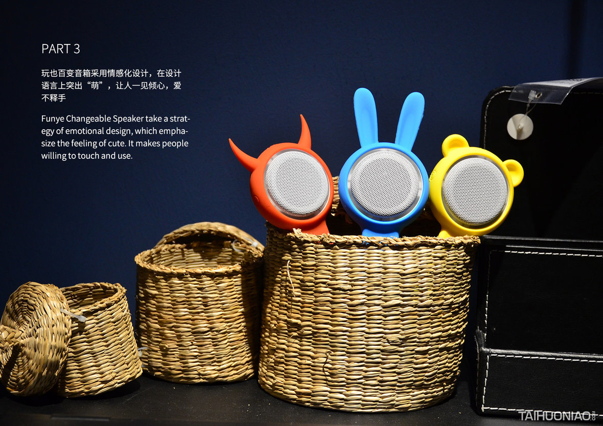 创新性:产品采用模块化的设计方式,由核心播放模块配合不同的外壳组件来适应不同的音箱使用场景。核心模块造型小巧,重量不到 100g,方便携带和使用。外壳组件采用高质量硅胶及记忆合金,可任意折叠且触感细腻,可以贴身佩戴或作为摆件摆放。模块化设计大大丰富了音箱的使用场景,同时节省了产品的制造成本,为产品生产商和用户带来价值。 实用性:玩也百变音箱通过模块化的设计使得产品能够以较低的生产成本来满足用户三种不同的使用场景。这三种场景包括:室内摆放、户外携带以及随身运动。产品包括一个核心播放模块以及三种不同造型和功能的高品质硅胶外壳,每种外壳对应一种应用场景,用户可以通过替换外壳来满足不同场景下的使用。 经济性:产品模块化及小型化的设计方式使得产品在生产成本与同类产品相似的情况下拥有更多的使用场景,从而提高了产品的市场竞争力,为生产商留下了巨大的利润空间。目前产品已经获得香港贸发局的肯定,获选“精粹创意礼品”荣誉,同时已经有多家经销商在销售该产品。玩也百变音箱已经出货数15万台.