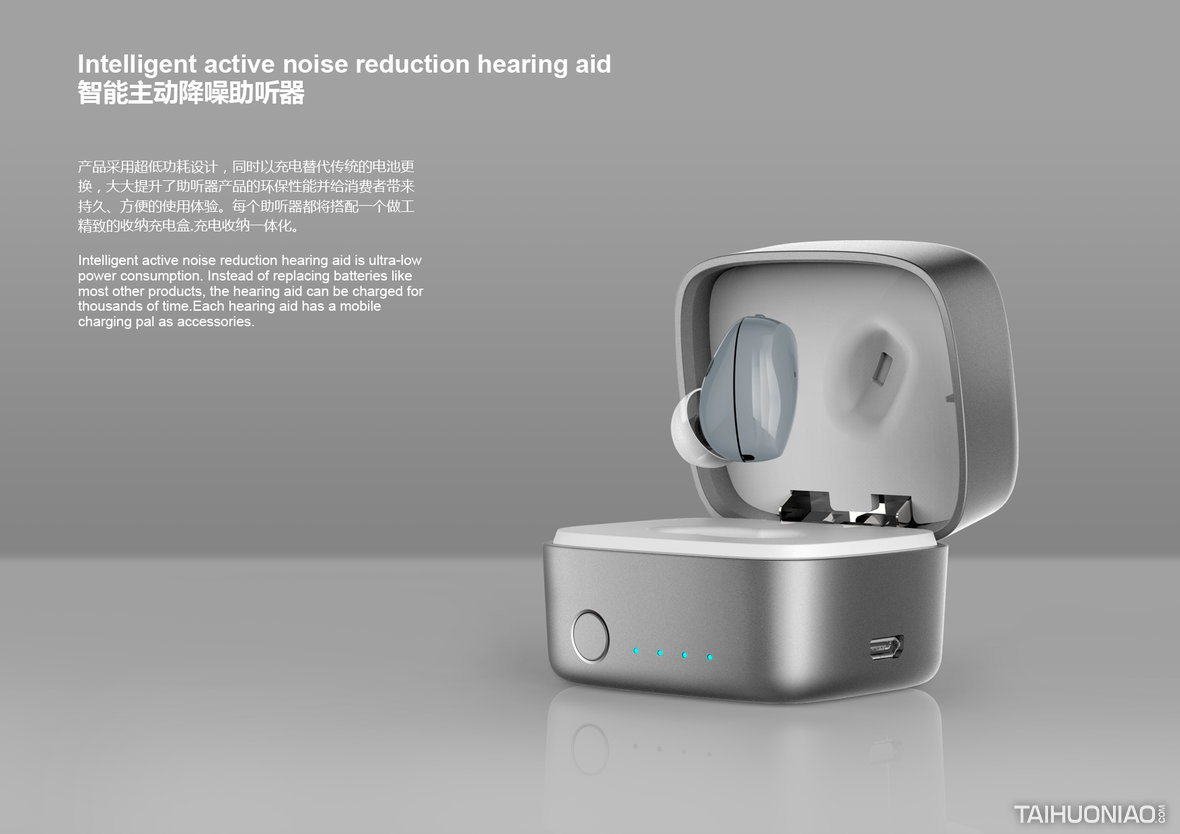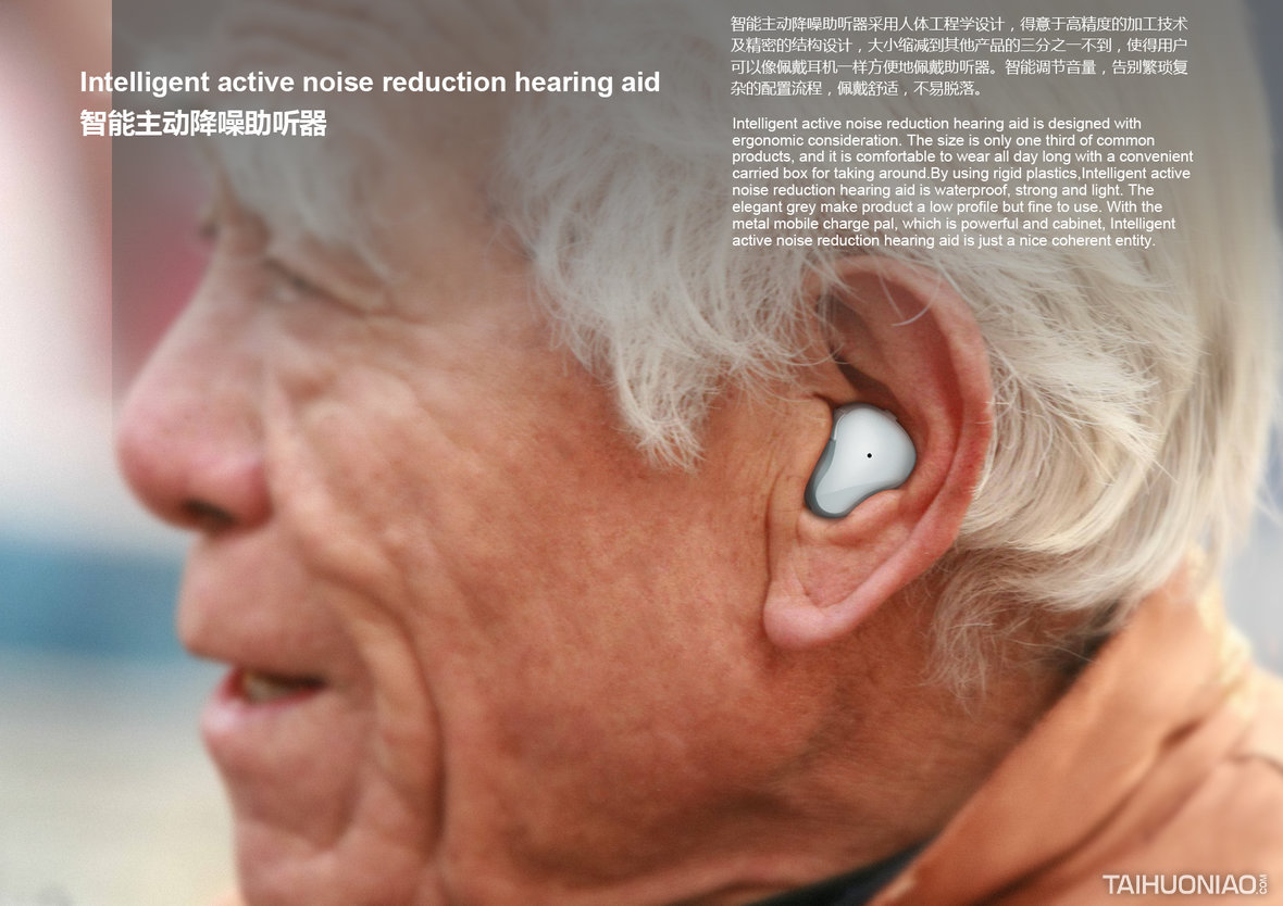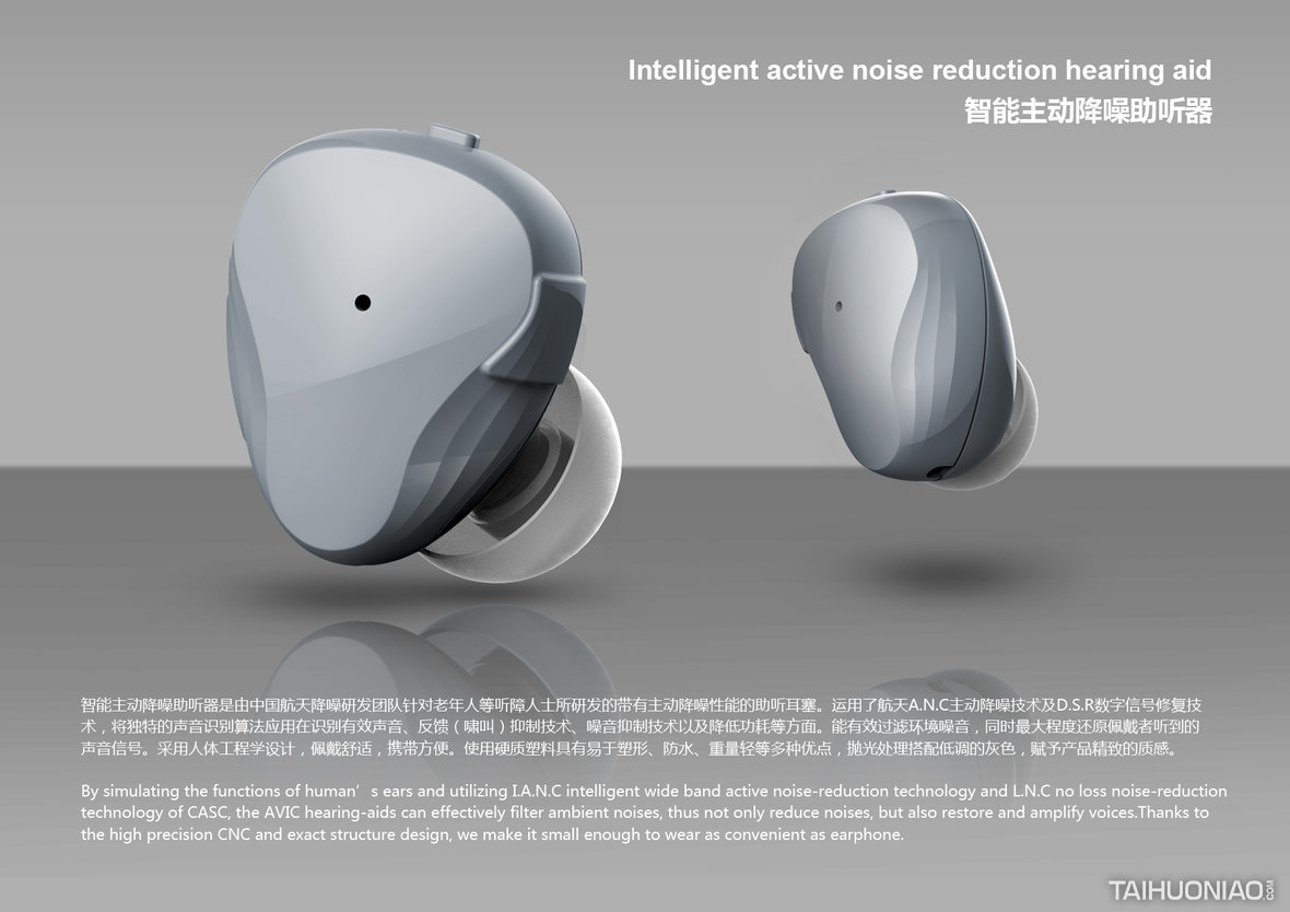 智能主动降噪助听器 E20/E30由中国航天降噪研发团队针对老年人等听障人士所研发的带有主动降噪性能的助 听耳塞。该产品有别于传统的助听器,它运用了航天A.N.C主动降噪技术及D.S.R数字信号修复技术,将独特的 声音识别算法应用在识别有效声音、反馈抑制技术、噪音抑制技术以及降低功耗等方面。产品性能获得突破性 革新,其综合水平已经达到世界顶尖水平,能有效过滤环境噪音,最大程度还原佩戴者听到的声音信号. 20/E30采用人体工程学设计,大小缩减到其他产品的三分之一不到,佩戴舒适,携带方便。得意于高精度的 加工技术及精密的结构设计,我们大大缩减了产品的尺寸,使得用户可以像佩戴耳机一样方便地佩戴助听器。 使用硬质塑料具有易于塑形、防水、重量轻等多种优点,抛光处理搭配低调的灰色,赋予产品精致的质感,同 时配合金属外壳的便携收纳充电盒,集便携与档次于一体,浑然天成。