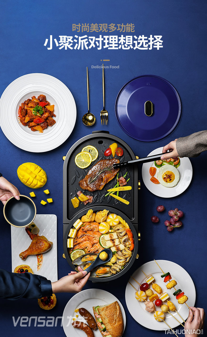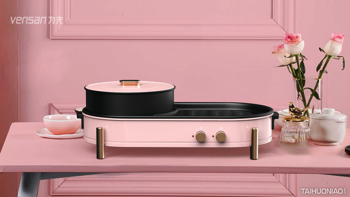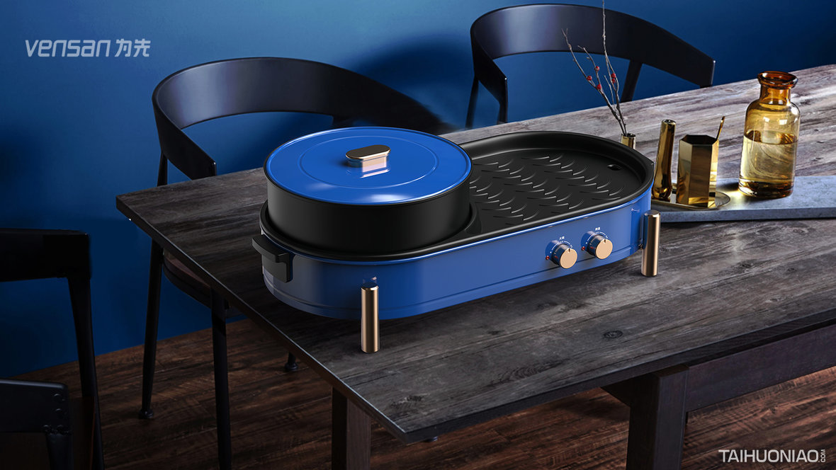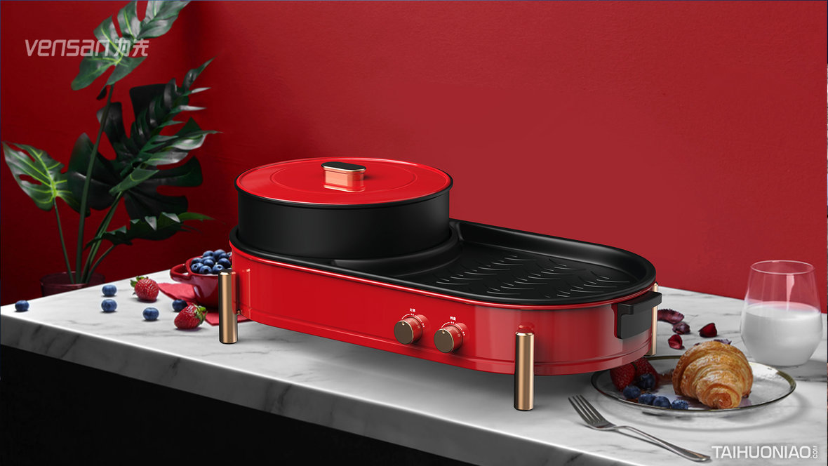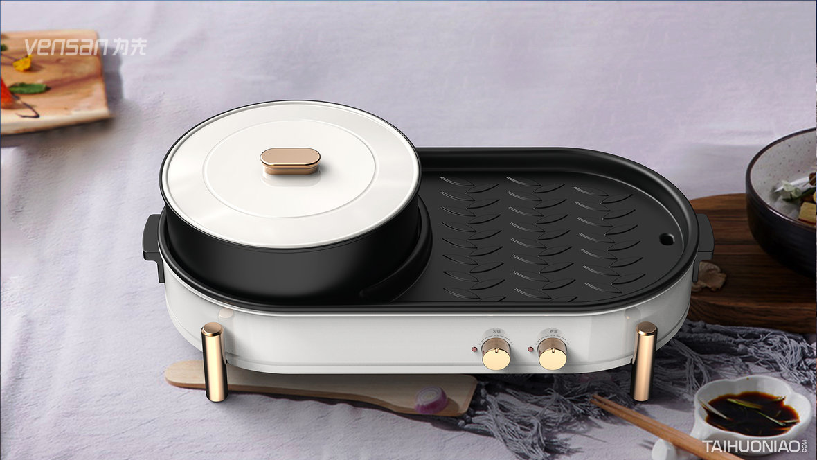 我们从挖掘消费潮流,洞察消费心理入手,定义厨房新主张。 通过分离式设计、双旋钮独立控温,满足涮烤随心变换。 金属外壳封闭式包裹,圆润包边搭配合金配件,轻奢的格调犹如艺术品般令人惊艳。 多功能涮烤一体锅,解锁不同美味时刻,让你成为当之无愧的厨神。