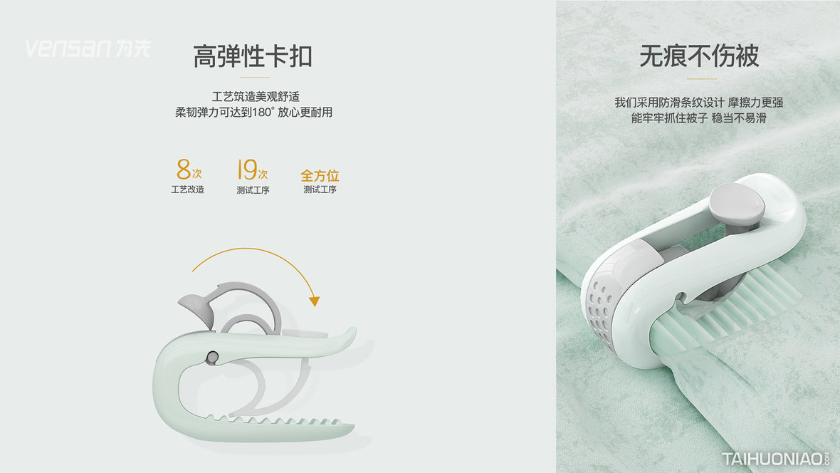 产品类别:被子固定器 行业突破:通过全新的固定方式,使得达到了无针无痕无解码器的产品突破。 创新性:彻底摒弃钢针的使用,以全新的固定方式达到固定被子的效果。完全打破了市场上千篇一律的钢针固定器的使用枷锁。从根本上解决了产品的安全性。