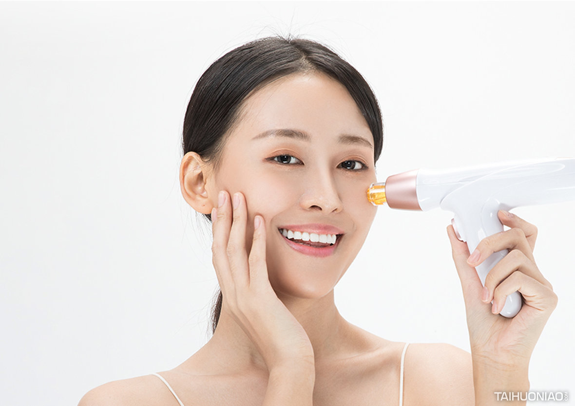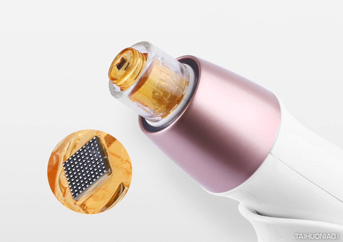 划时代将高科技生物芯片与半导体科技有机结合,突破皮肤角质层阻隔,在肌肤表面打开上千个吸收通道。搭配多种专属精华原液在家轻松做美容。水光枪整体造型不能过度科技,作为女性产品,水光枪整体用纤细的曲线勾勒产品外轮廓,头部尾部可拆卸更换营养液,搭配玫瑰金这种非常时尚、靓丽的颜色,突出展示产品特点,让女性更为美丽。 伴随微电流导入精华能量的同时,机身头部释放红蓝光深度作用于肌肤,平滑嫩肤。机身尾部配备微电流按摩头,通过按摩将微电流传导到肌肤深层,促进面部肌肤锻炼。 水光枪还配备了一个手柄,轻松安装,手柄和机身均可操作,曲线的手柄设计,及考虑到人握手柄的姿势状态也测试过拿美光枪的使用体验。机身上一键开关,三个档位操作,更多的考虑到女生肤质的不同,从各个方面为女性考虑。