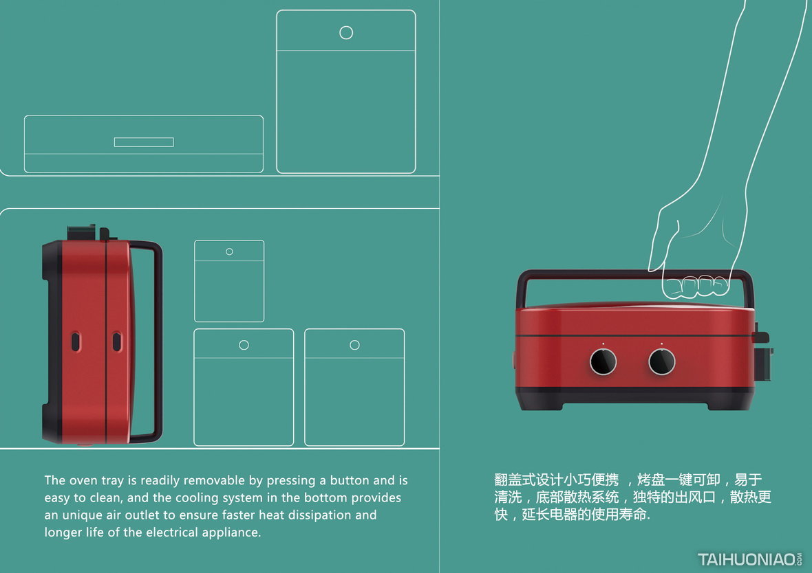 是国内外第一款集火锅、烧烤于一体的可折叠多功能电烧烤器具。它们可用于油炸、搅拌、烹饪、炖、烤和即煮。蛤壳的设计大大缩小了罐子的体积,而横截面则像一张A4纸那么大,这减少了储存空间和物流成本。它体积小,携带方便,可用于各种场合。 整个锅体操作平台平坦,使用平稳。只需按下一个按钮,便可轻松拆卸火锅及烤盘,并易于清洁。烤盘的底部纹理设计得像流水,这样烤盘在使用过程中可以更好地积聚油和热量。同时,加热可以更加均匀,这样食物就不会容易煮过头。双旋钮可分别控制火锅和烤盘。无级调节与防滑旋钮相结合,使操作更加人性化。 它是由环保、无污染、可生物降解的PP材料制成,回收率高,大大减少了资源的浪费。烘箱托盘按下按钮即可轻松移动,底纹选用特殊涂层材料制成的流痕图案,烹饪过程中不产生油烟,易于清洗,减少了资源浪费和环境污染。