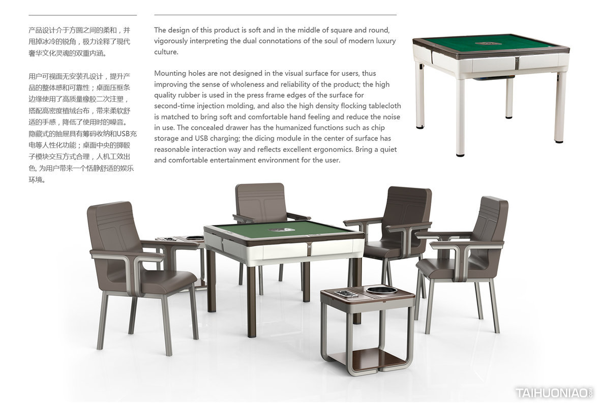 1、 T6通过机芯快扣设计,取拿更方便,降低了企业安装和售后成本,解决了消费者难安装的痛点,并且T6不仅仅是棋牌桌,还可以当餐桌使用,与家居环境没有违和感,一桌两用使T6提高了自身性价比,被消费者广泛接受。T6推入市场不到一年,现在的销量已达到40000台左右,相信T6可以拥有更广泛的市场。 2、 T6麻将机采用的ABS工程塑料及实木板材等均为环保材料,让用户在绿色健康的环境下娱乐。桌面压框条边缘使用了高质量橡胶二次注塑,可使T6表面充满柔感,增加桌面的功能性与附加值。搭配高密度植绒台布,持久耐用。 3、 边框大面积镶嵌古铜色半透明件,给产品丰富的光影,在材质上、造型上体现产品的专业感、品质感。全机消音设计,5重降噪,让码牌更静、更舒适。 4、 外观上T6汲取了3C类产品的设计元素,与居室环境完美协调。视觉中心“T”形符号元素贯穿其中,赋予产品强烈的识别度;边框设计运用经典的上下拼接设计手法,清爽、雅致,外型纤薄有型,造型轮廓分明,透明与实体的结合,肌理张弛有度,极具视觉冲击力。产品设计介于方圆之间的柔和,并甩掉冰冷的锐角,极力诠释了现代奢华文化灵魂的双重内涵。