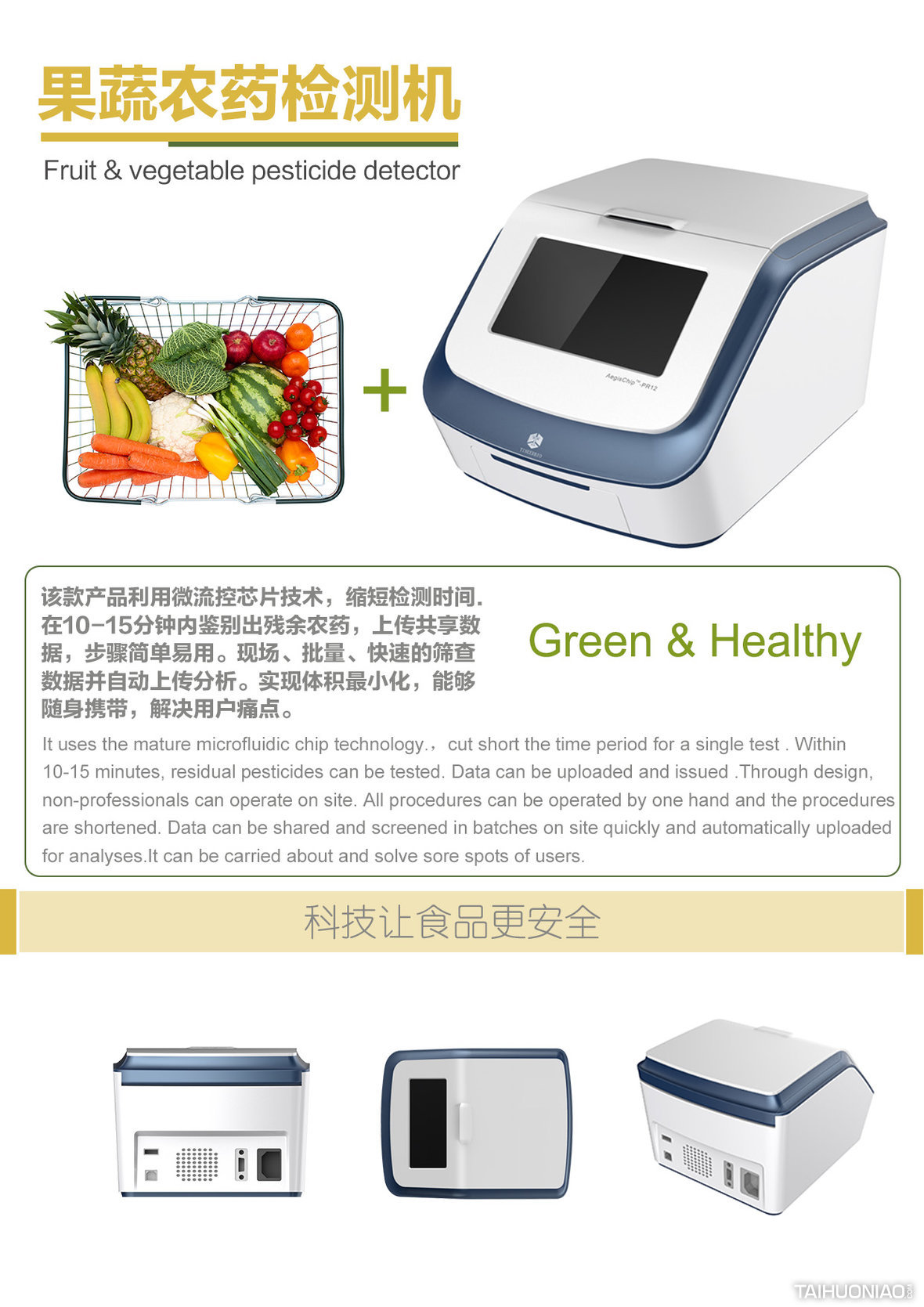 果蔬用药检测仪是一款独特的能快速、准确分析检测农药残留的产品,他能在10-15分钟内鉴别出果蔬中是否有残余农药,将数据上传,让人们安心的享用健康绿色食品,可以广泛应用于卫生防疫、环境保护、工商管理、蔬菜批发市场、超市、商场等部门的蔬菜和水果中的农药残毒检测。利用成熟的微流控芯片技术,解决了当前食品安全检测存在的技术问题,同时笔式速测仪建立了一种全新的农药残¬留快速、准确分析检测平台。