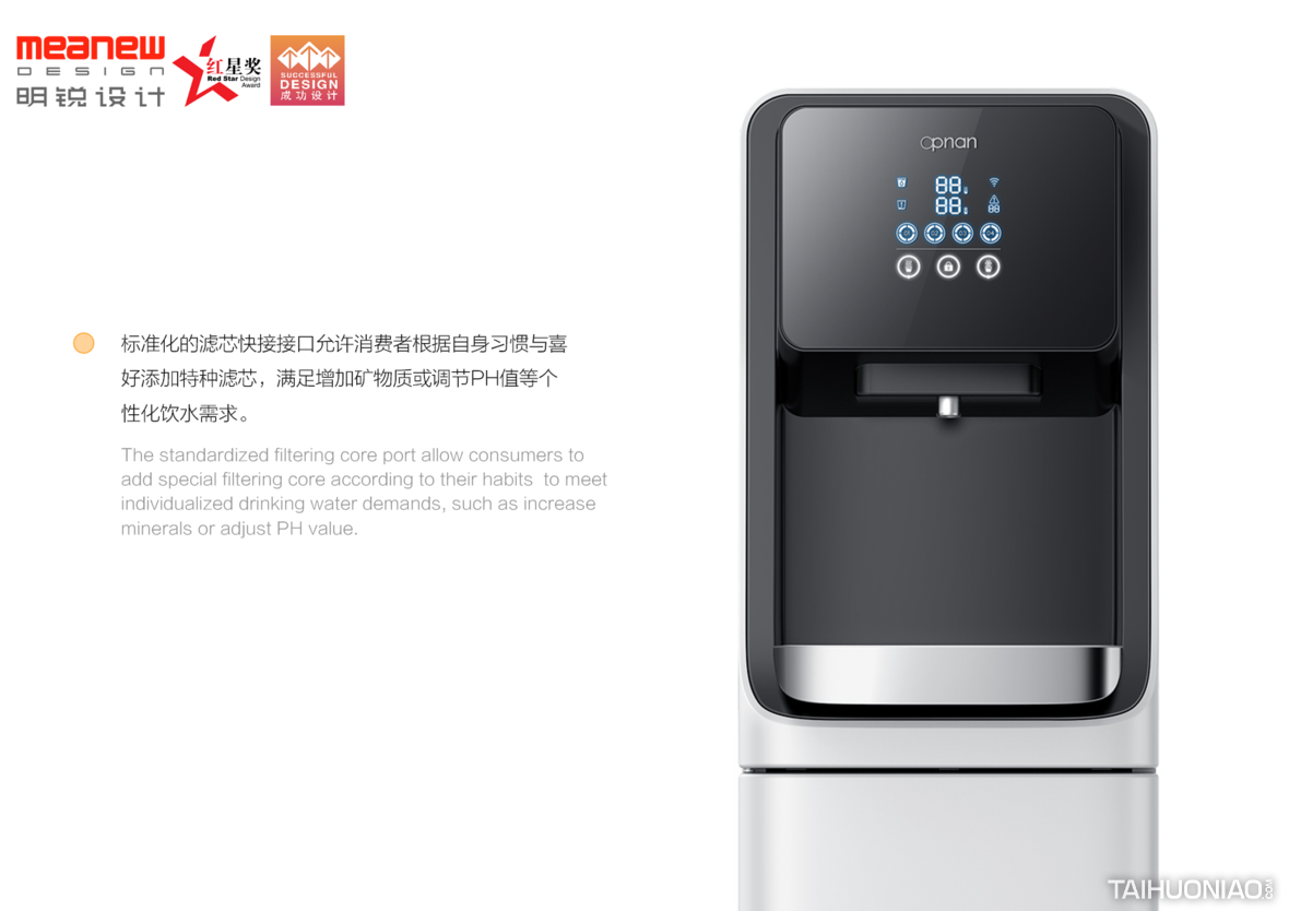 明锐工业设计原创 MEANEW DESIGN | OPNAN智能净饮机在外观上采用北欧极简设计语言,整体架构成熟可靠,独具智慧操控面板,所有信息一目了然。不仅适用于各种家庭环境,同时也兼顾了公共场合的商用需求,为健康饮水提供了一体式解决方案。