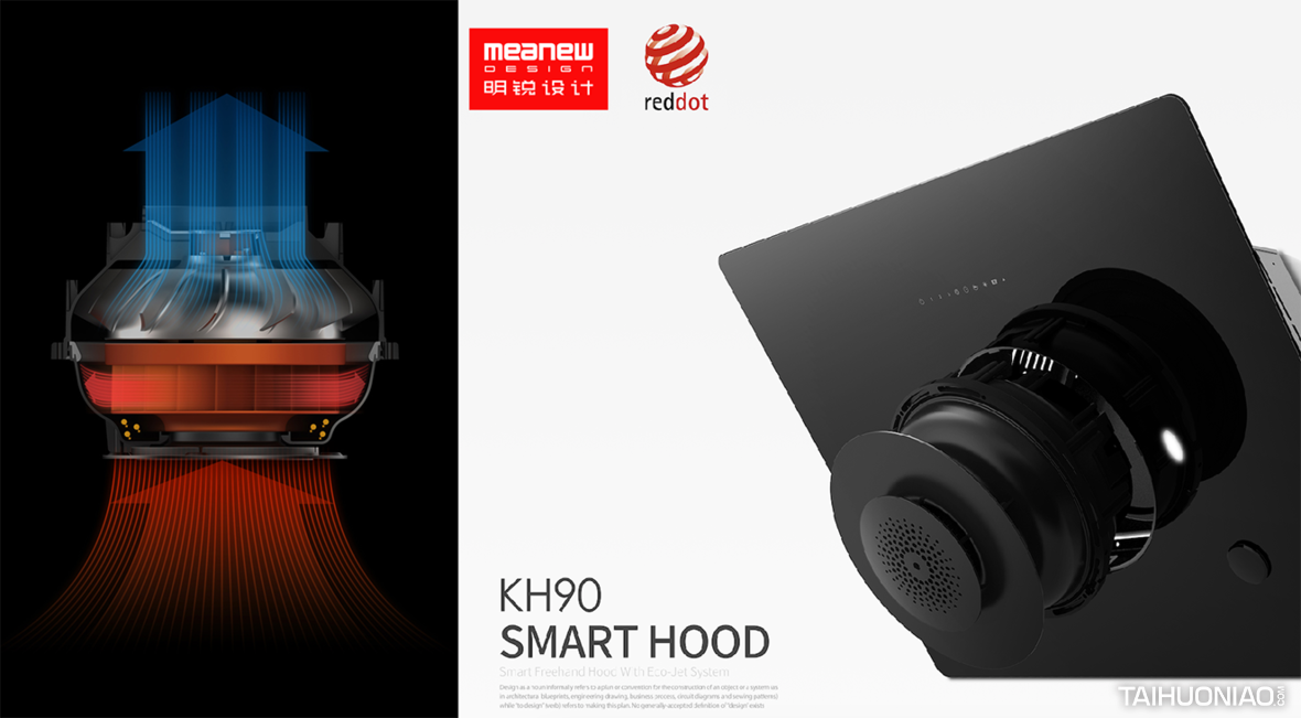 明锐工业设计原创 MEANEW DESIGN | KH90 Free B烟机采用欧洲最流行的侧吸式平板烟机设计,结合突破性的Eco-Jet System进烟系统,抽风、油烟分离、过滤等步骤几乎在同一时间完成。同时Eco-Jet System采用可分离单元设计,极大提高了产品的可靠性与灵活性。