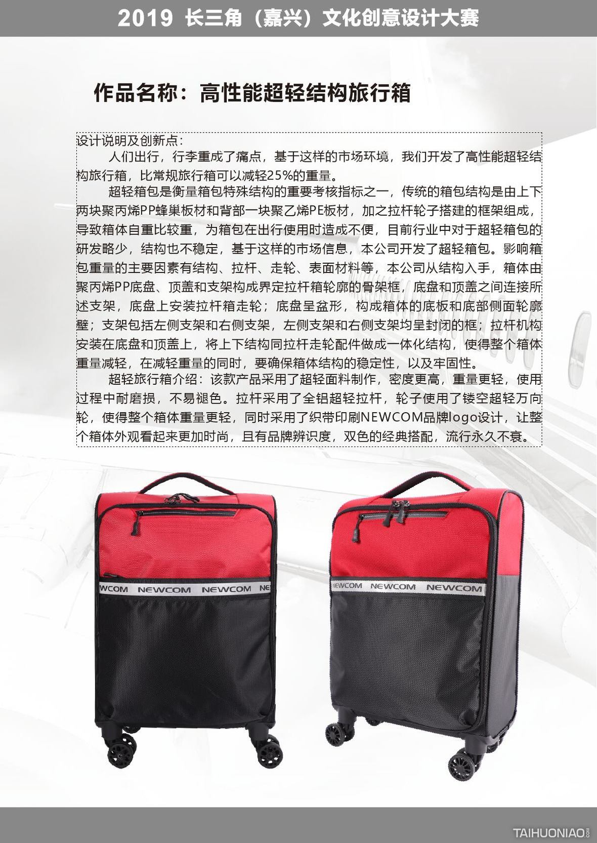 超轻箱包是衡量箱包特殊结构的重要考核指标之一,传统的箱包结构是由上下两块聚丙烯PP蜂巢板材和背部一块聚乙烯PE板材,加之拉杆轮子搭建的框架组成,导致箱体自重比较重,为箱包在出行使用时造成不便,目前行业中对于超轻箱包的研发略少,结构也不稳定,基于这样的市场信息,本公司开发了超轻箱包。影响箱包重量的主要因素有结构、拉杆、走轮、表面材料等,本公司从结构入手,箱体由聚丙烯PP底盘、顶盖和支架构成界定拉杆箱轮廓的骨架框,底盘和顶盖之间连接所述支架,底盘上安装拉杆箱走轮;底盘呈盆形,构成箱体的底板和底部侧面轮廓壁;支架包括左侧支架和右侧支架,左侧支架和右侧支架均呈封闭的框;拉杆机构安装在底盘和顶盖上,将上下结构同拉杆走轮配件做成一体化结构,使得整个箱体重量减轻,在减轻重量的同时,要确保箱体结构的稳定性,以及牢固性。 超轻旅行箱介绍:该款产品采用了超轻面料制作,密度更高,重量更轻,使用过程中耐磨损,不易褪色。拉杆采用了全铝超轻拉杆,轮子使用了镂空超轻万向轮,使得整个箱体重量更轻。