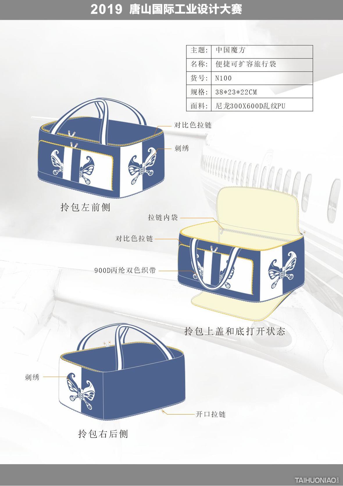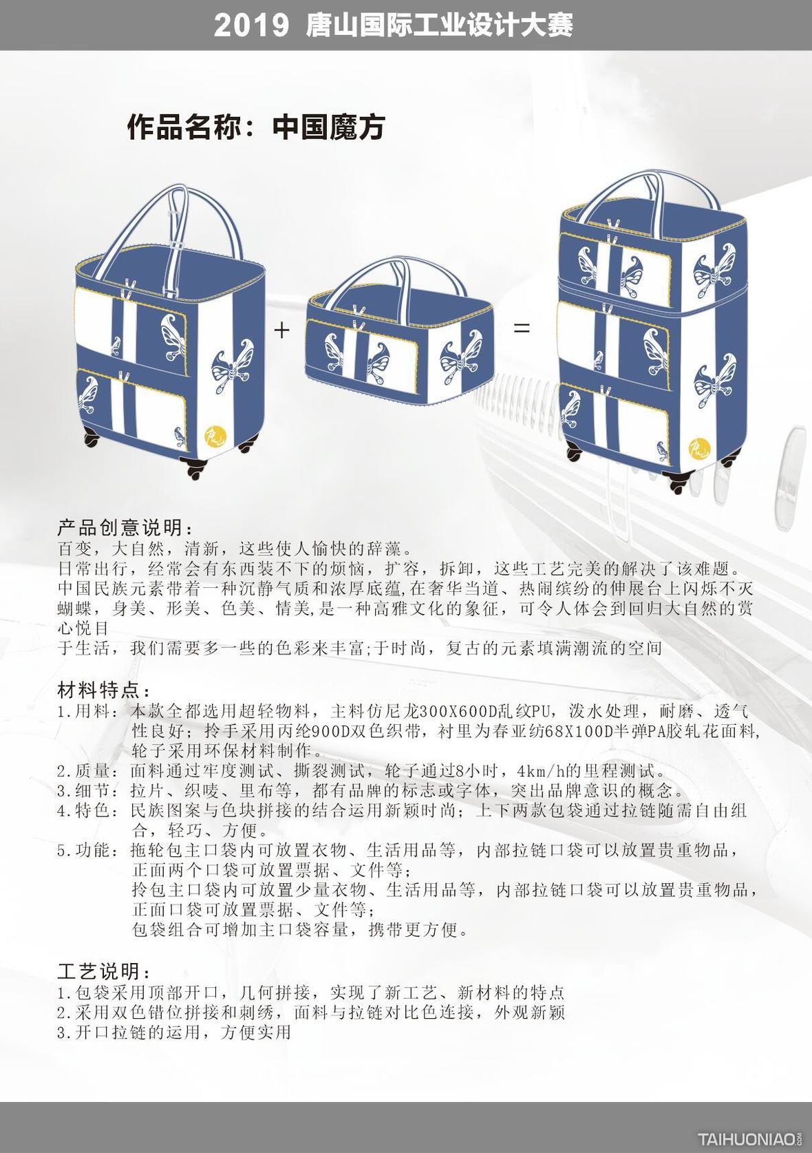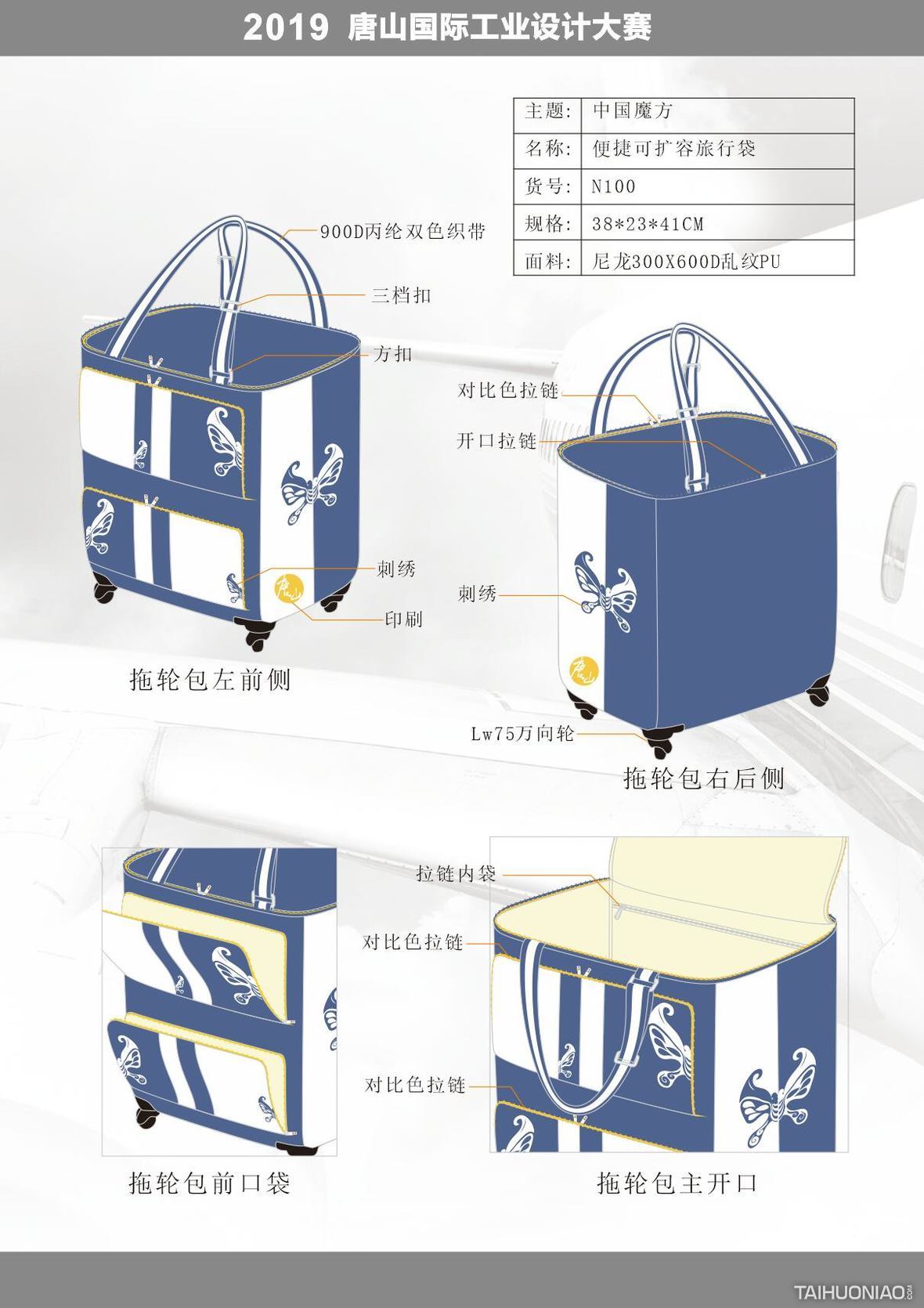 产品创意说明: 百变,大自然,清新,这些使人愉快的辞藻。 日常出行,经常会有东西装不下的烦恼,扩容,拆卸,这些工艺完美的解决了该难题。 中国民族元素带着一种沉静气质和浓厚底蕴,在奢华当道、热闹缤纷的伸展台上闪烁不灭 蝴蝶,身美、形美、色美、情美,是一种高雅文化的象征,可令人体会到回归大自然的赏 心悦目于生活,我们需要多一些的色彩来丰富;于时尚,复古的元素填满潮流的空间 材料特点: 1、用料:本款全都选用超轻物料,尼龙300X600D乱纹PU,泼水处理,耐磨、透气 性良好;拎手采用丙纶900D双色织带,衬里为春亚纺68X100D半弹PA胶轧 面料,轮子采用环保材料制作。 2、质量:面料通过牢度测试、撕裂测试,轮子通过8小时,4km/h的里程测试。 3、细节:拉片、织唛、里布等,都有品牌的标志或字体,突出品牌意识的概念。 4、特色:民族图案与色块拼接的结合运用新颖时尚;上下两款包袋通过拉链随需自由组 合,轻巧、方便。 5、功能:拖轮包主口袋内可放置衣物、生活用品等,内部拉链口袋可以放置贵重物品, 正面两个口袋可放置票据、文件等;