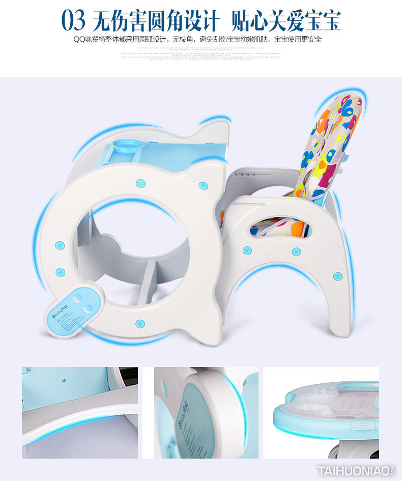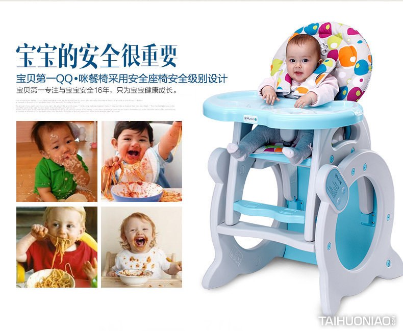QQ咪——国内首例一椅多用,多功能结构创新桌椅组合: 1.独具创新单手操作托盘功能; 2.产品更高的稳固安全性,独创新功能; 3.高椅组合,6个月-3岁的幼童使用,他们可以坐在上面用餐,并能诱导他们能够自食其饭;桌椅组合,3岁-6岁的儿童使用,将座椅取下,儿童坐在上面便可以学习、玩耍; 4.结构简洁、安装简便,整个餐椅基本无金属配件,用一硬币即可安装完整个餐椅。