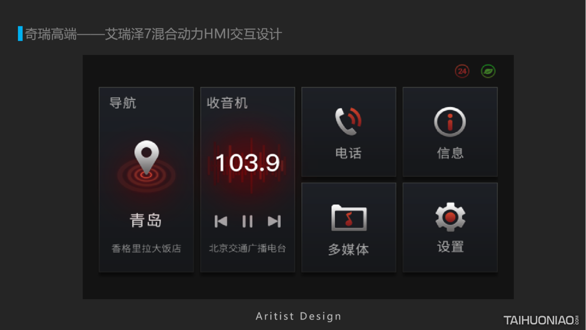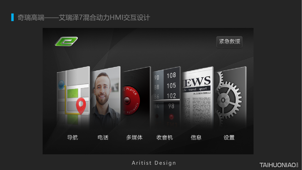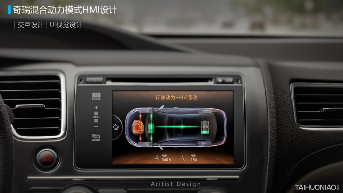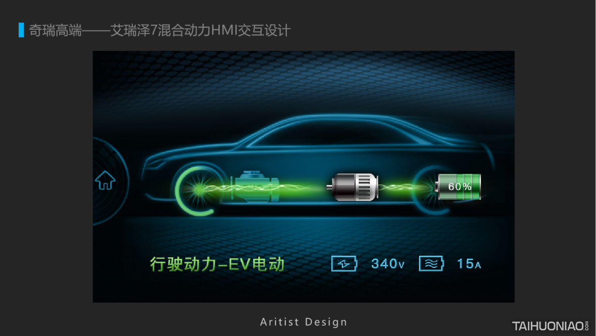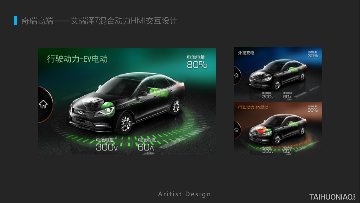 2017年为奇瑞艾瑞泽7E混合动力HMI设计,已经量产发布上市,在当时BYD,宝马,丰田刚开始推出混合动力汽车时,此款设计相对理念是非常领先和超前的了。 设计创新点: 用户在开车时不可能像竞品哪些车型,可以看到供电或者用油动力的线路图,危险往往是发生在0.5秒之间,此款设计从用户交互的整个场景的色彩出发,用户只要知道颜色就知道在什么工作模式,如用电模式、发动机模式、怠速充电,刹车充电等,而无需看细节,那么酷炫效果就留给副驾驶看吧。 好的UI设计是在解决问题,让生活更简单。
