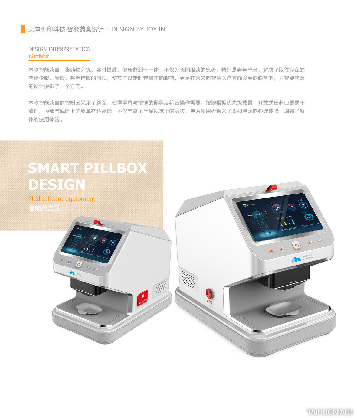 本款智能药盒,集药物分拣、实时提醒、健康监测于一身,不仅为长期服药的患者解决了以往存在的药物少服、漏服的问题,使其可以定时定量正确服药,同时为未来智慧医疗提供了一种方向。