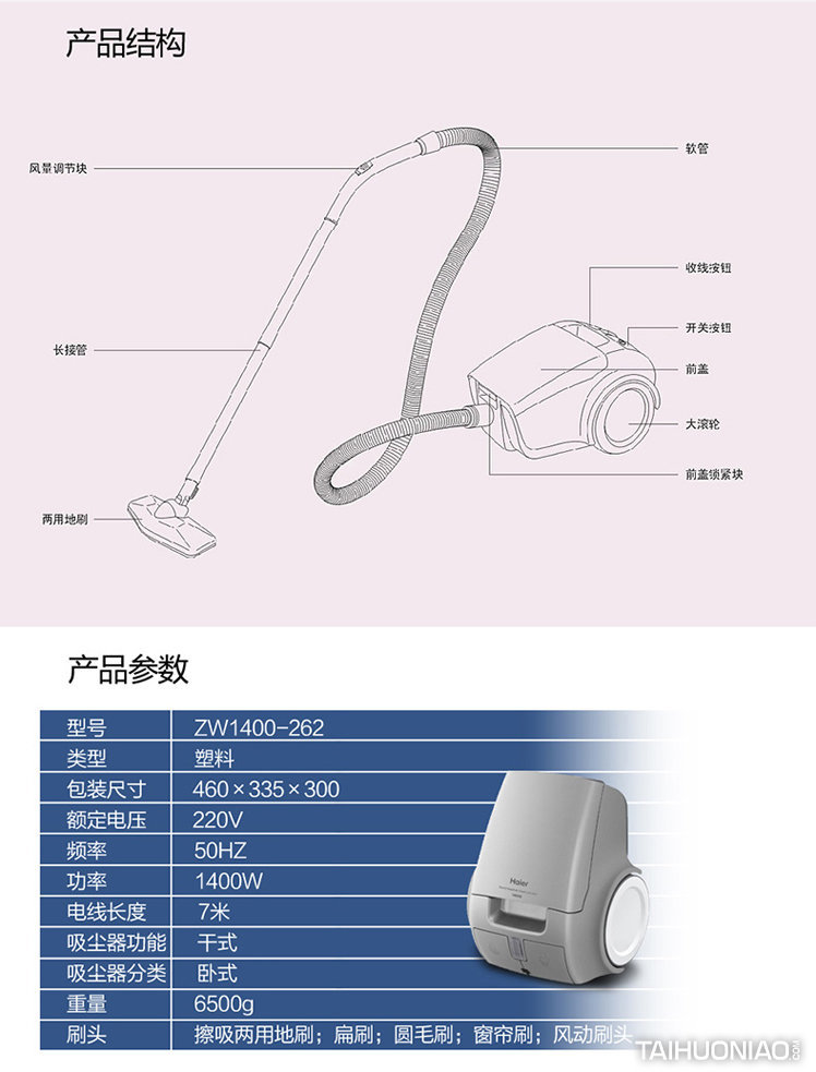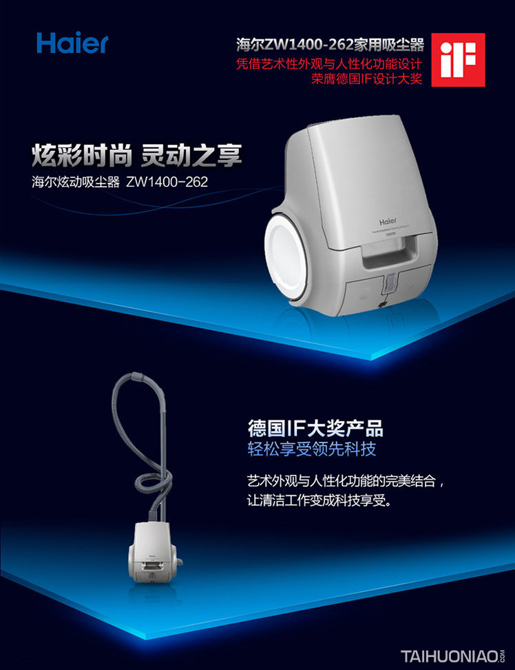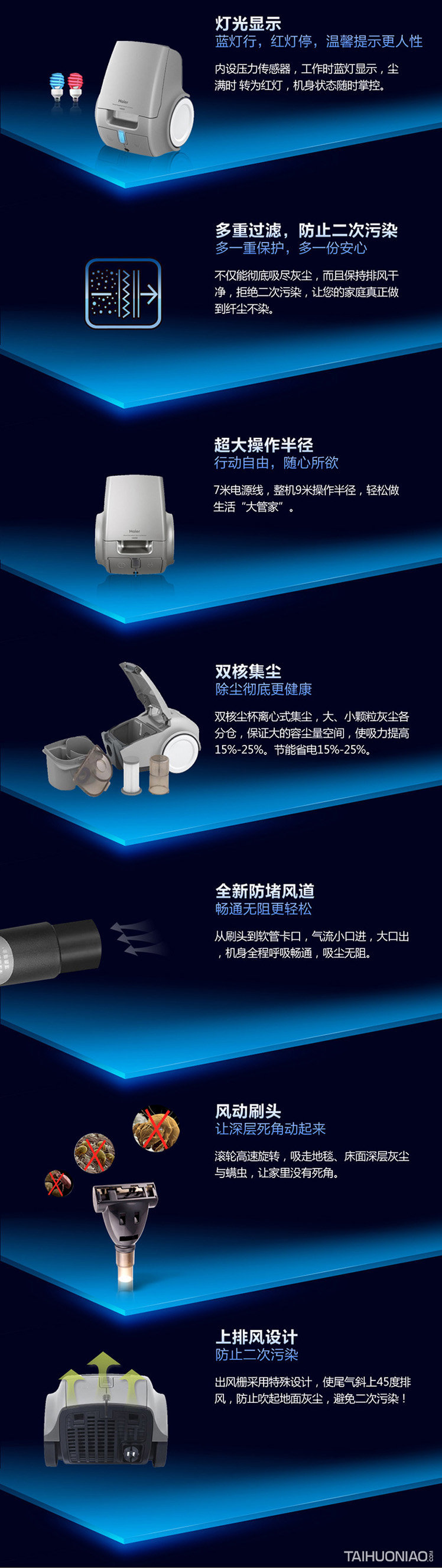 外观设计炫动时尚,机体上带有气泡纹理装饰,凸显本机的动感时尚,软性脚轮的设计,不但移动方便,更不会划伤地板,内部采用双腔高效“龙卷风”技术,通过离心力,将大颗的垃圾物分离到远离HEPA的滤芯腔内,并且HEPA罩和高效过滤的滤芯将灰尘再次过滤,避免进入电机造成损坏;红外无线双向的把手设计,内部防堵的风道,即使家中有头发团或者较大的污物,也不会堵塞,很人性化。集尘满后,自动变为红光的显示,提醒你该进行清理了;采用暗开关的金属伸缩管设计,配合7米电源线,可打扫更广的范围,让主妇不必再考虑电线的束缚,多种刷头和吸头的配置,可以打扫更多的家居空间。