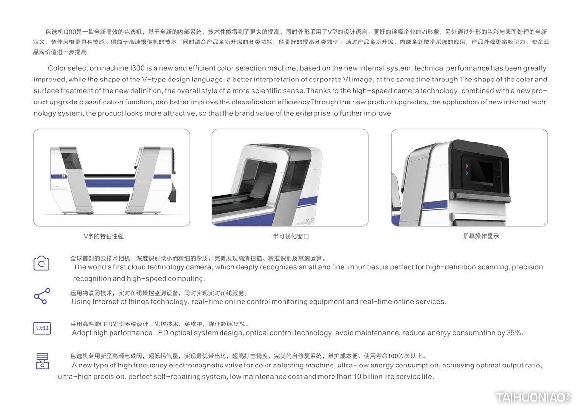 色选机I300是一款全新高效的色选机,基于全新的内部系统,技术性能得到了更大的提高。 其造型的设计语言能更好的诠释企业的VI形象,让该产品能在众多企业中脱颖而出。 技术性:得益于高速摄像机的技术,同时结合产品全新升级的分类功能,能更好的提高分类效率。 全球首创的云技术相机,深度识别微小而精细的杂质,完美展现高清扫描、精准识别及高速运算。 运用物联网技术,实时在线操控监测设备,同时实现实时在线服务。 采用高性能LED光学系统设计、光控技术,免维护,降低能耗35%。 色选机专用新型高频电磁阀,超低耗气量,实现最优带出比,超高打击精度,完美的自修复系统,维护成本低,使用寿命100亿次以上。 造型性:通过产品全新升级,内部全新技术系统的应用,产品外观更富吸引力,使企业品牌价值进一步提高。 同时外形采用了V型的设计语言,更好的诠释企业的VI形象,同时通过外形的色彩与表面处理的全新定义,整体风格更具科技感。