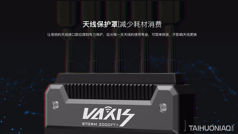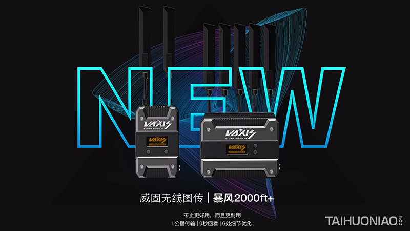 以两块色块的拼接将屏幕显示区域很多的分割出来,突显出多功能特征,上下的栅格设计元素,迎合了图传远距离传输的特征,整体专业感强