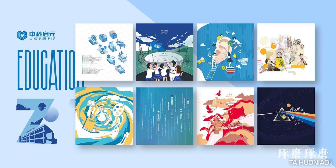 每个字母对应画面都与品牌及企业文化深度契合,通过直观的画面,设计并阐述了每一个字母背后的故事,传达出品牌的强大教育实力和科学基因。 比如“D” (Demo Science,萌动科学)灵感源自Pink Floyd乐队在1973年发行的经典专辑《The Dark Side of The Moon》。构图中将中科启元的吉祥物“大萌”置于三棱镜中,以其作为介质,光线从左入通过后变成了各种各样的可视化图形,借此表达萌动科学为孩子们将复杂的科学原理转译成通俗易懂的生动形式。 又如,字母“P” (Predomination,卓越),由于此主题需要表达较多的数据,故在画面表现形式上选取了较为冷静、现代感的2.5D视觉风格,辅以蓝粉白为主的配色;在模块的构图安排上也采取了矩阵的形式将两组数据用各式各样的创意组合在一起成为一组图形来呈现往年的各项数据,以加强大数据的表现力。