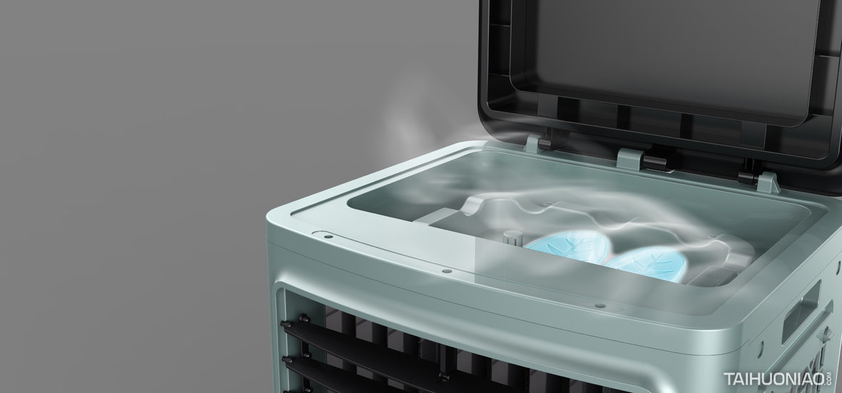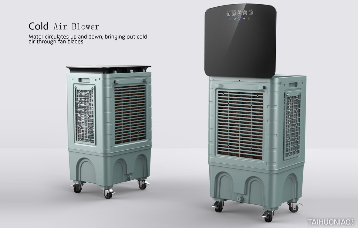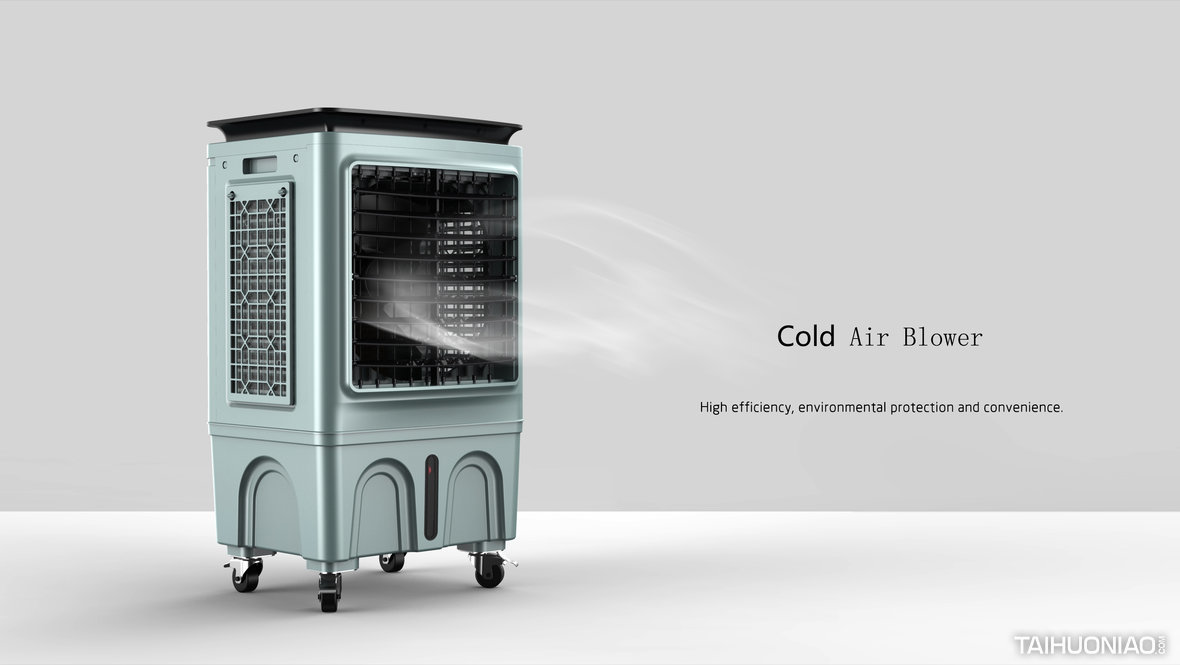 这是一款室内室外两用的工业冷风机产品,功率大制冷效果强,能满足各种无法安装空调或是户外露天的所有大型工作场所的降温需求;在产品运行前打开上方盖子放入专业配备冰块(冰块可循环使用),倒入适量水,随后水会随着内部轨道经过中间冰帘流动至下方的蓄水箱并持续上下循环流动,液体水流动使扇叶转动时输出清凉风从而达到快速降温、制冷的效果。