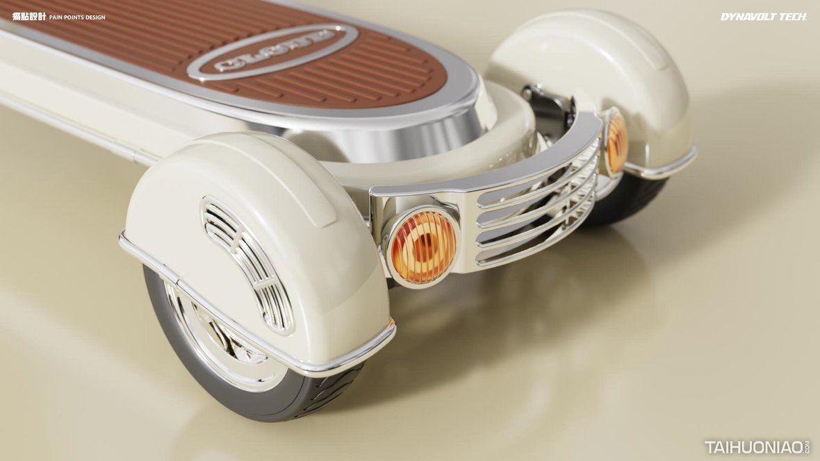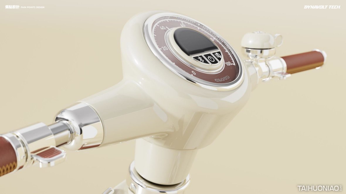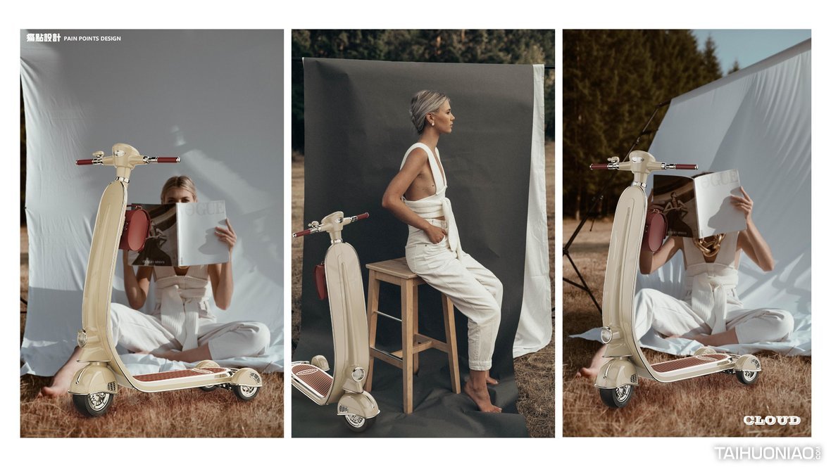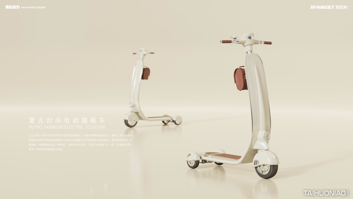 CLOUD是一款专为女性用户设计的电动滑板车。针对女士随身背包在骑行中不方便携带问题,我们做了皮包配挂设计,解决了用户在使用滑板车过程中没有存放空间的麻烦;三轮设计使滑板车在出行过程中更加稳定。整体造型柔和,风格复古时尚,使用滑板车是一种环保、低碳的出行方式。正如产品名称“云”,它希望为用户提供一种轻松舒适的旅行体验。