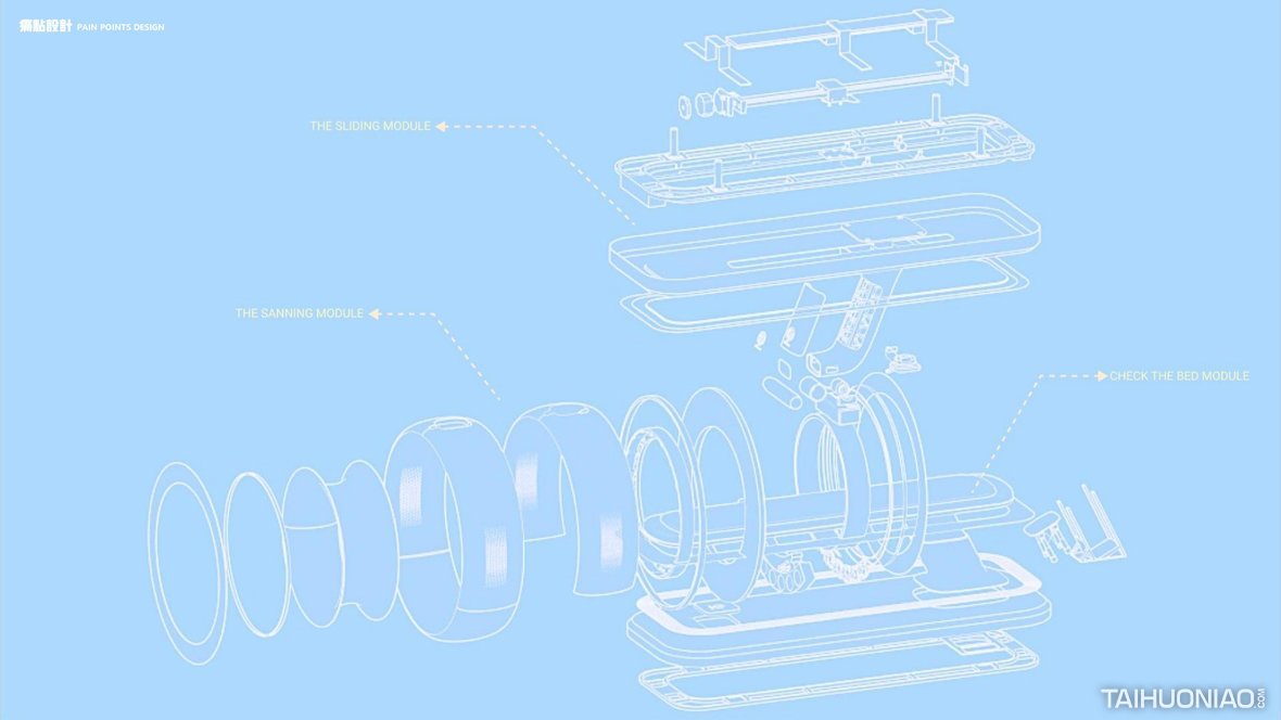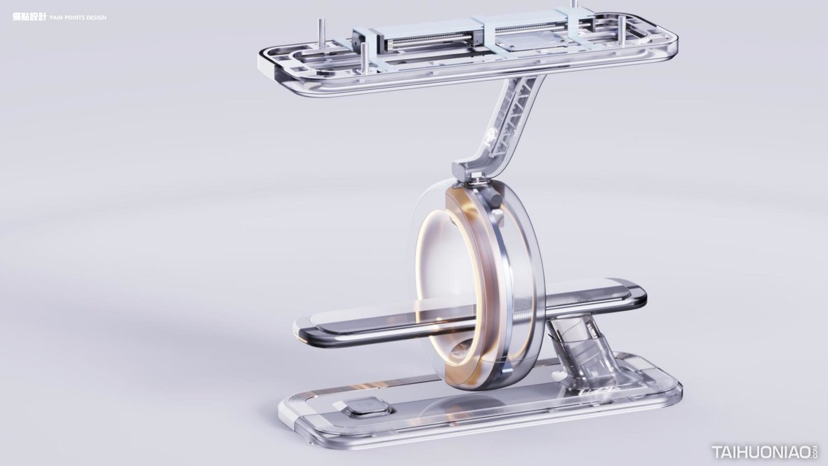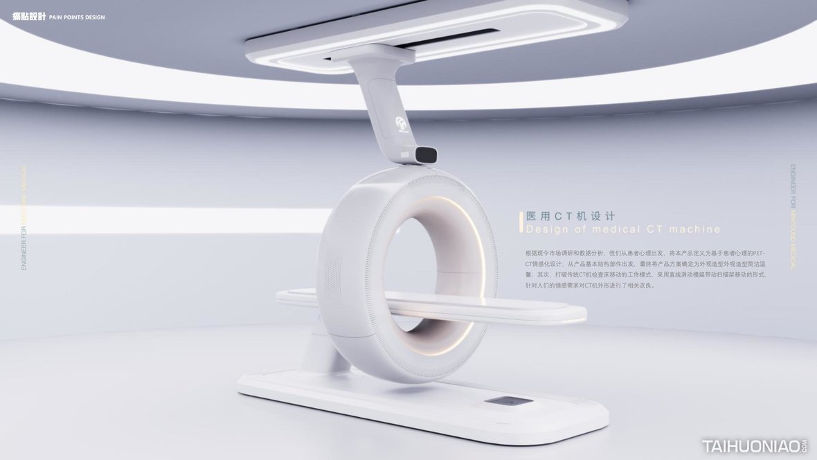 根据现今市场调研和数据分析,我们从患者心理出发,将本产品定义为基于患者心理的PET-CT情感化设计,从产品基本结构部件出发,最终将产品方案确定为外观造型外观造型简洁温馨;其次,打破传统CT机检查床移动的工作模式,采用直线滑动模组带动扫描架移动的形式,针对人们的情感需求对CT机外形进行了相关改良。
