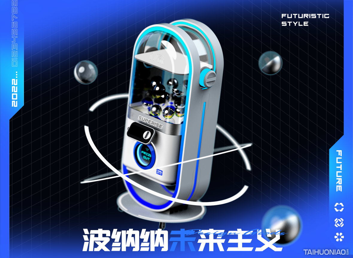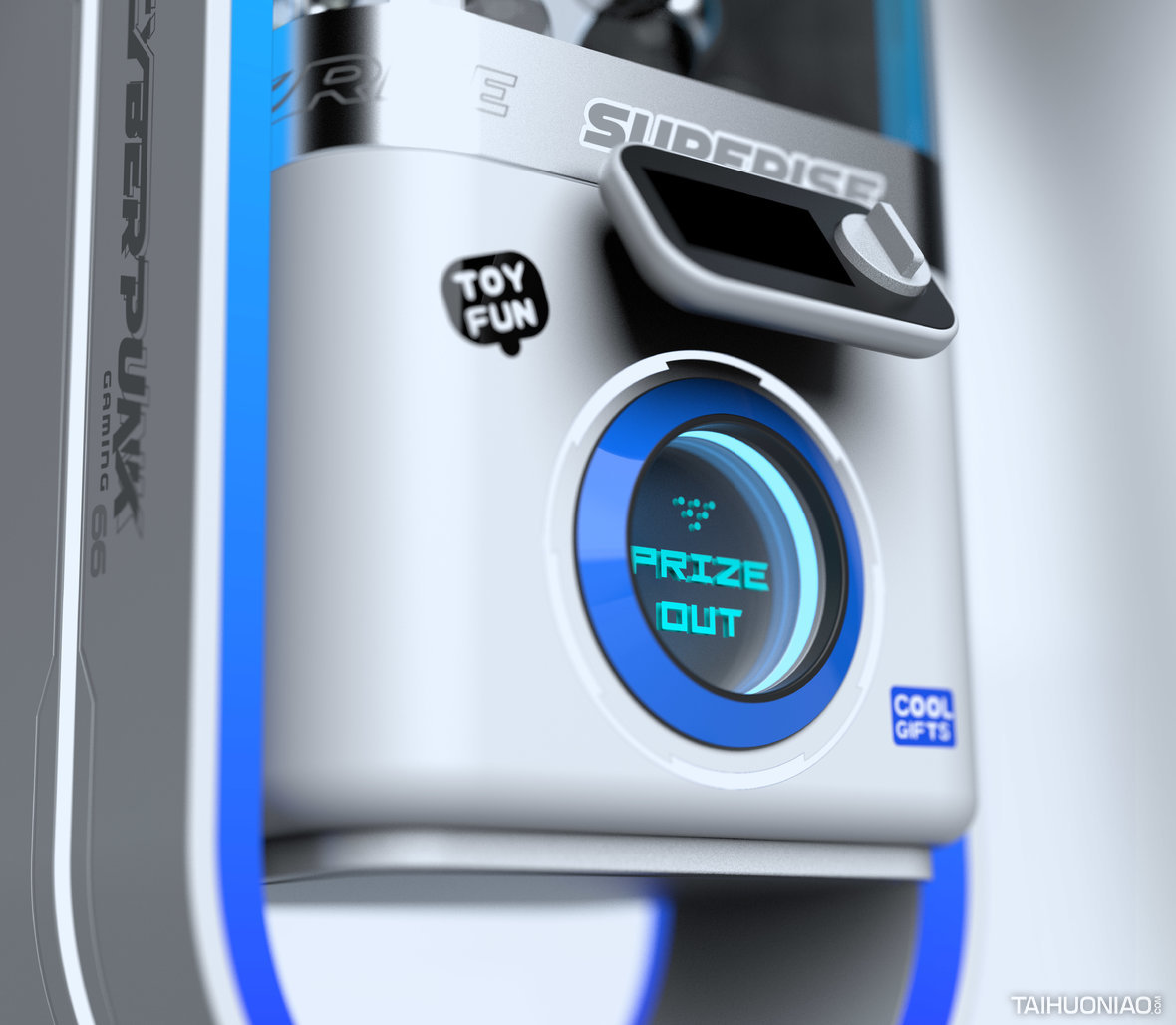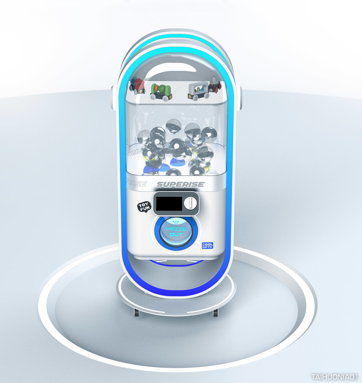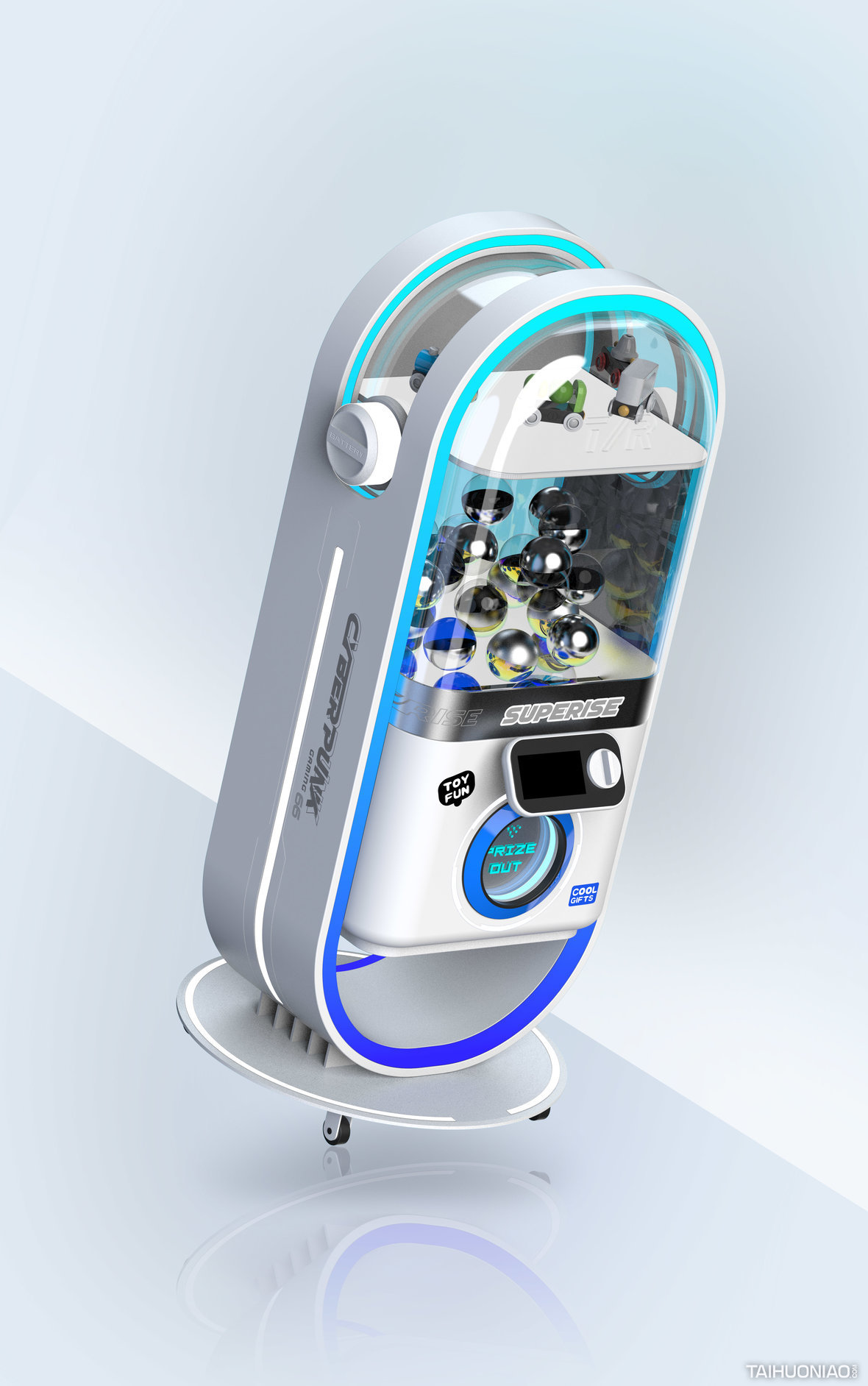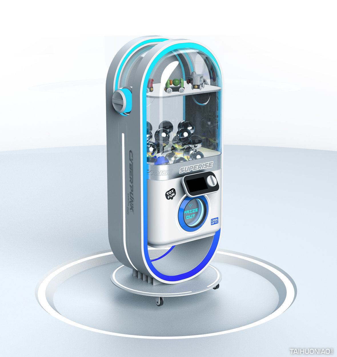 TOY/FUN赛博朋克扭蛋机 爆款设计/网红经济 2022 设计思路: 扭蛋机和娃娃机已经遍布商场的角落,我们将未来主义与赛博朋克风格引入该领域,快闪店与临时摊位可以快速地吸引客户驻足。 整个设计采用圆角矩形作为主要造型语言,传达出太空舱的设计语义。用简单的钣金工艺实现未来主义元素的提炼。 娃娃机与扭蛋机行业不仅需要室内设计更需要工业设计进行仔细雕琢。