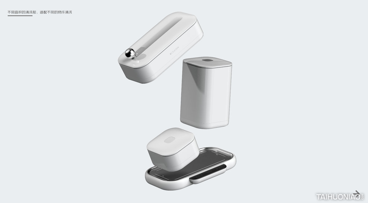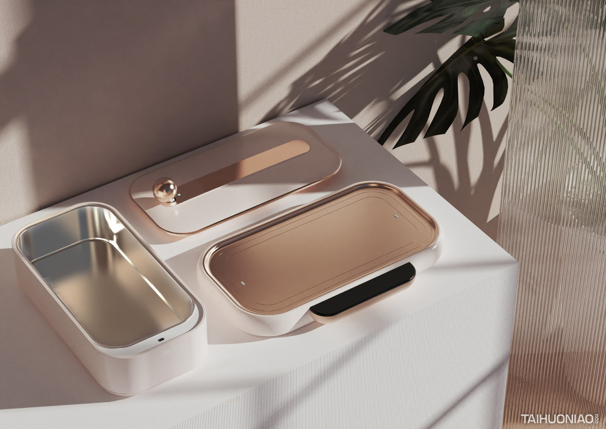 复古超声波清洗机 项目时间: 2021/10 这是针对女性客群设计的一款超声波与UV一体清洗机。外形采用复古亲和的风格使其摆脱工具化属性,轻松融入生活场景。有别于市面上同类产品简约风格。它可以模块化地替换不同容积的清洗舱实现不同使用场景的切换。机械手柄球头可以快速启动记忆模式,增加了体验的趣味性,让清洗体验焕然一新。