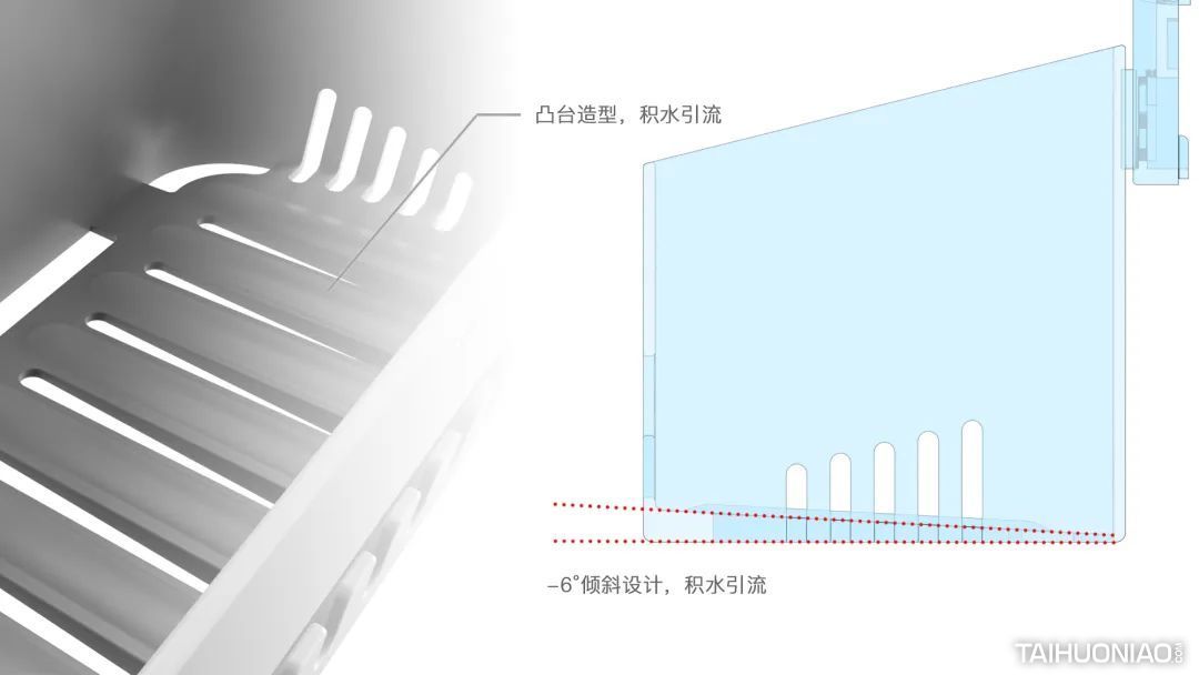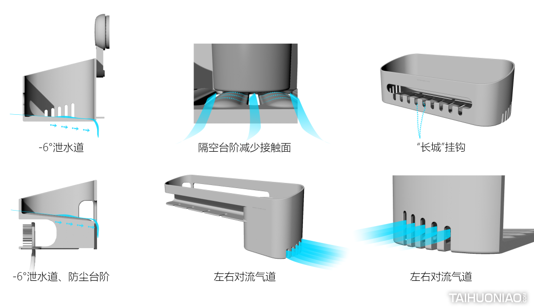 太力集团创立于1999年,专注于真空类家居收纳用品行业20多年,是中国最大的科技型家居用品互联网生态企业,在全球已累计申请700多项专利技术,业务覆盖全品类家居收纳用品,全方位满足家庭生活和差旅出行的收纳和整理应用。 太力以追求舒适、极简、有序的家居生活环境为己任,从家居收纳开始,结合技术研发优势,开发吸盘挂钩、置物架等产品,把家化繁为简,从而达到干净舒适的状态,为用户打造优质生活新境界。 置物架巧妙设置了-6°倾斜排水槽,让积水引流至后部排除多余积水,同时内斜面设计有效解决沉重后向前倾的问题。为避免细菌产生,在置物架下方开设沥水口,两侧开设多个导风口,加快水分蒸发。 服务客户:太力 服务团队:麦芒设计中心 服务内容:市场调研 | 产品策略与定位|外观设计