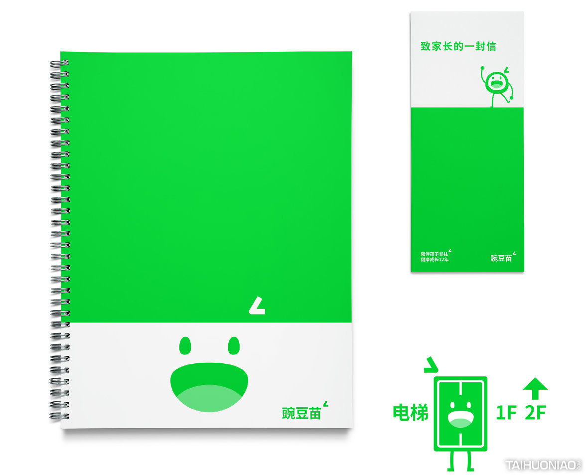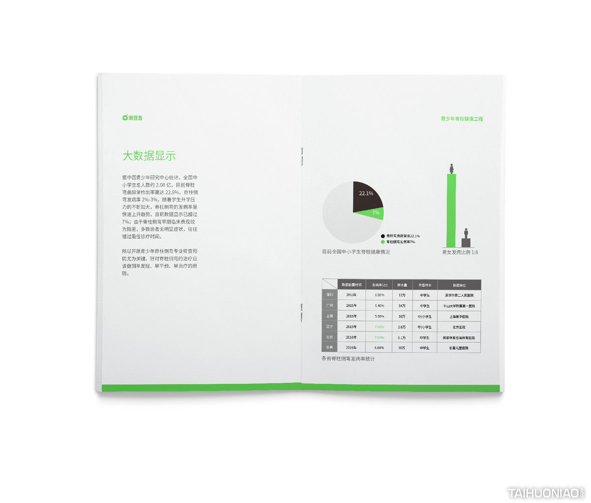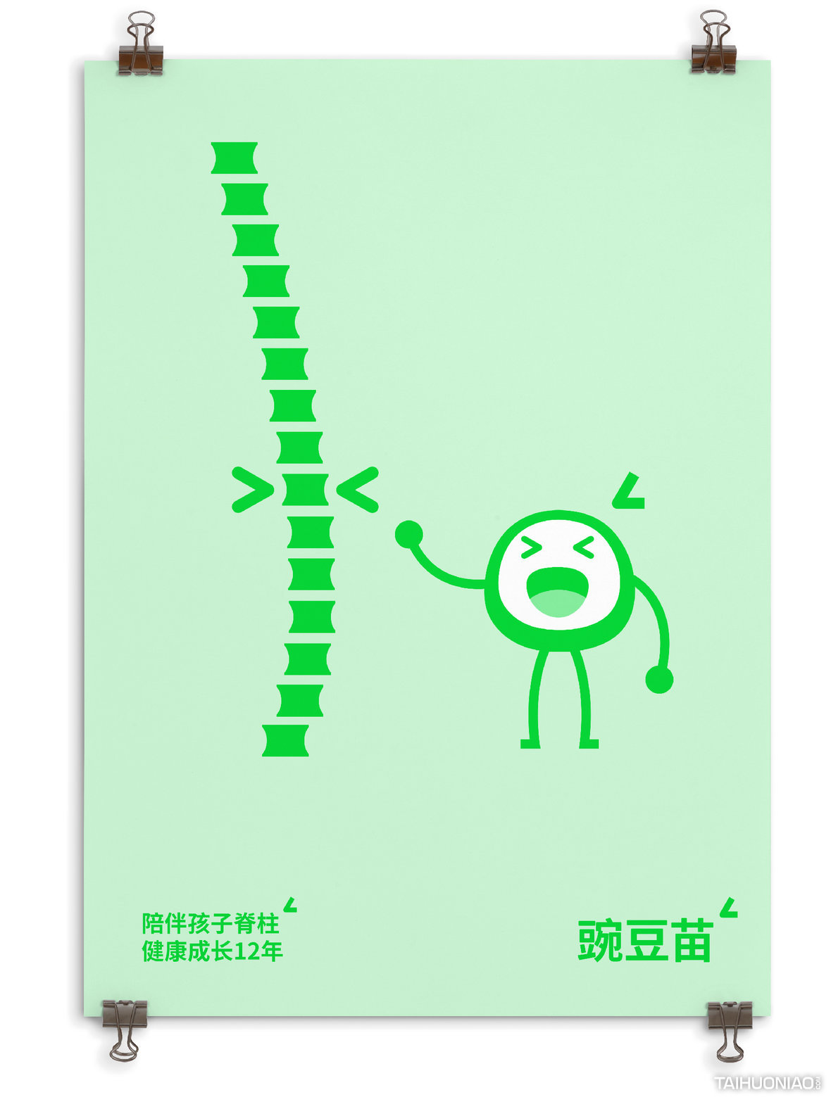 ART DIRECTOR : 谢大欢 DESIGNER : 李彦达;吴颖晗 YEAR : 2018_08 CLIENT : WANDOUMIAO 豌豆苗是一个致力于保护孩子避免“脊柱侧弯”的机构。通过对品牌的研究,我们提出“品牌与消费者的关系”是这个品牌思考的重心。“陪伴孩子脊柱健康 12 年”是我们思考后找到的突破口。我们通过一个成长中的豆子形象,满足了品牌面对不同阶段的孩子以及家长应该有的传播形象。让豆子与孩子共同在需要关注“脊柱成长”的关键 12 年里一同成长,构建了一个陪伴型的品牌形象。特别的是在颜色上,我们采用了专色荧光绿。通过在纸质物料上用专色印刷,一方面提升了品牌的视觉独特性,另一方面因为专色不能被打印的特性,提高了物料的信任感与权威性。