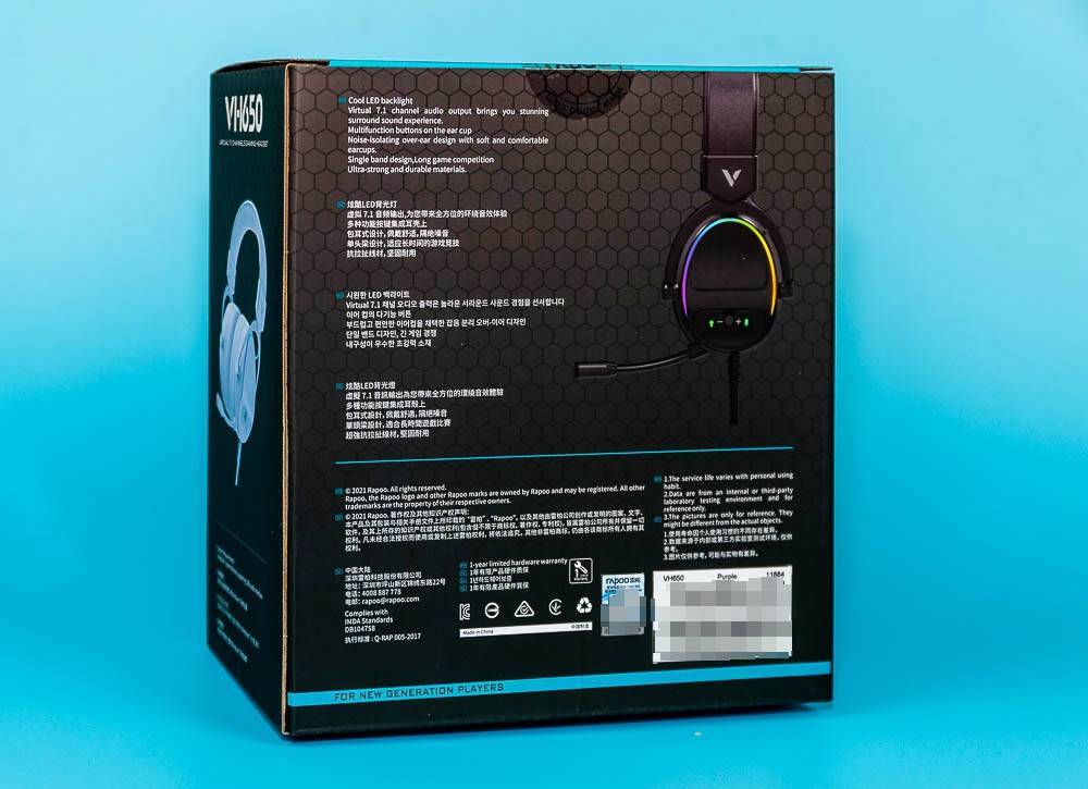 雷柏(Rapoo) VH650,是一款虚拟7.1声道游戏耳机。耳机直径50mm,灵敏度103±3dB 1KHz,阻抗32欧姆 1KHz,频响范围20-2WHz。具有两种颜色,迷雾紫和暗夜黑。头戴式电竞耳机,具有RGB灯效。线长245cm,重量约336g。麦克风咪头尺寸直径4&1.5mm,全指向,灵敏度-42±3dB,阻抗2.2KΩ。