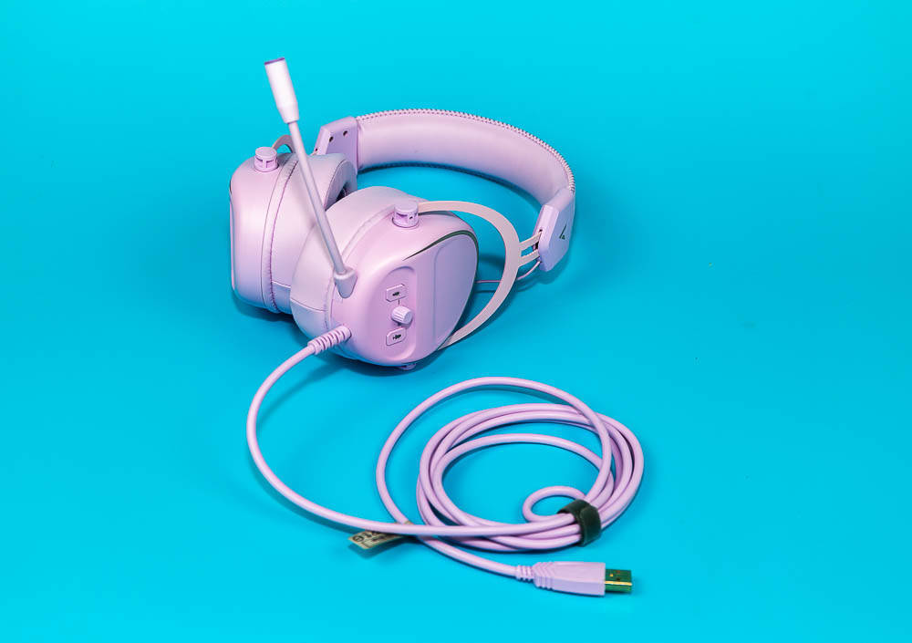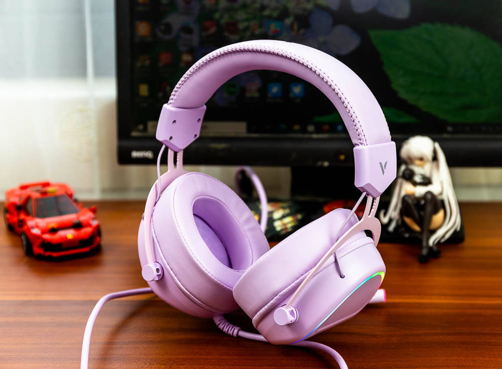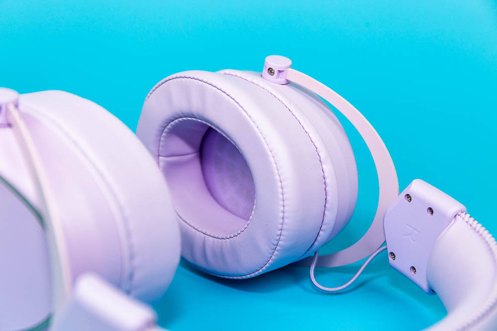 我的雷柏 VH650是迷雾紫色,我个人比较喜欢这种淡紫色,觉得比较素雅,无论男女戴上去都非常好看,同时打破了清一色全黑的色彩搭配。这款耳机是头戴式电竞耳机,可以看到耳机的耳罩海绵非常厚,耳罩也比较大,同时顶部头梁下的海绵有比较厚实,佩戴起来应该比较舒适。同时耳机主体有坚固的钢结构,因此这款耳机还是比较稳固的。雷柏 VH650的线比较长,采用的是六芯线材,抗干扰性能更强,更加坚固耐用,线长大约245cm,同时线材上有捆束粘布,可以根据需要收紧或者放出,在线材的连接处,有加固的设计。