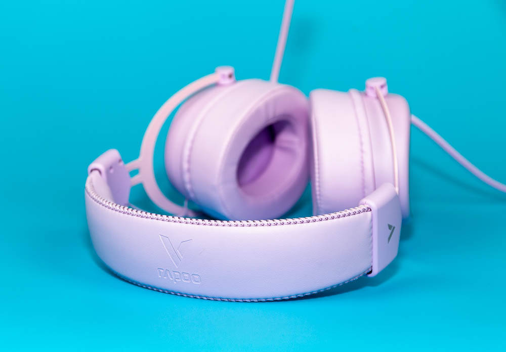 头梁的两侧有灰色的雷柏V形LOGO;在头梁的顶部,还有V形的LOGO和雷柏的英文的阴文,让这款耳机的头梁时尚而不单调沉闷。头梁下采用的是约2cm厚的高密度耐水解皮质海绵,防水耐汗透气,减少佩戴时的压迫感,确保长时间游戏不会累。