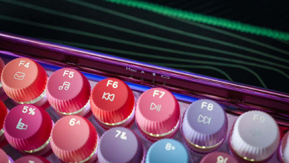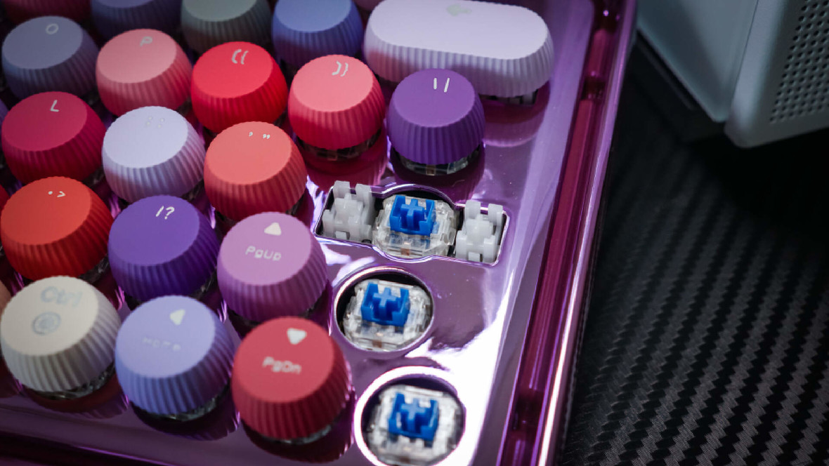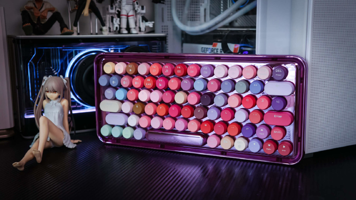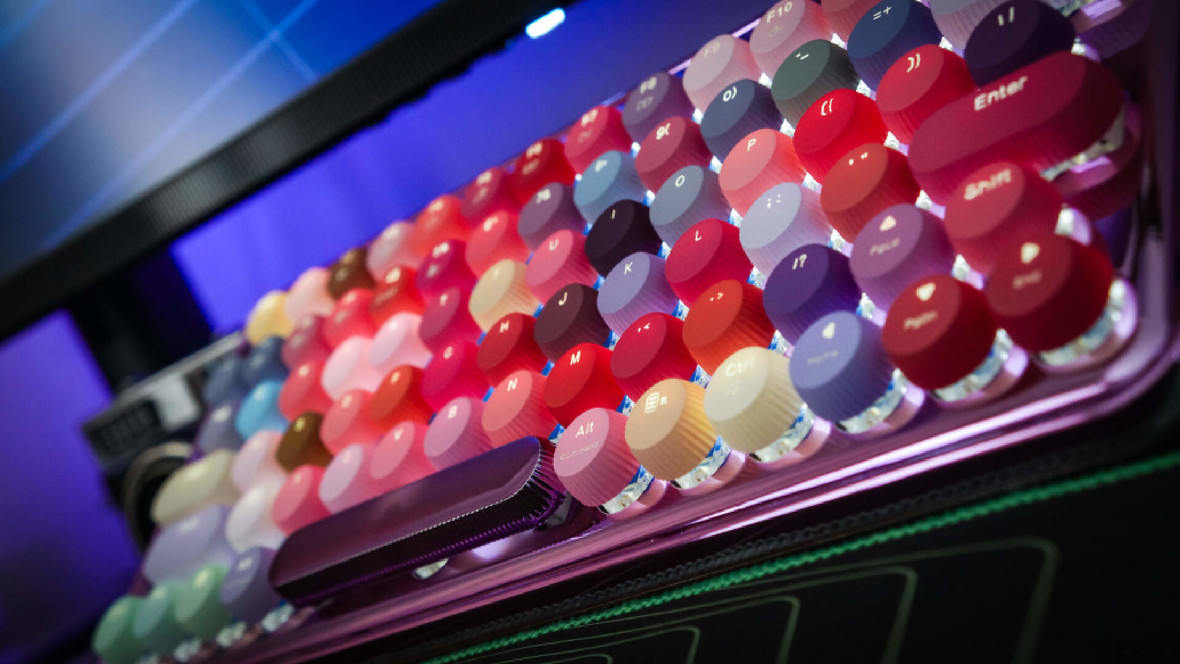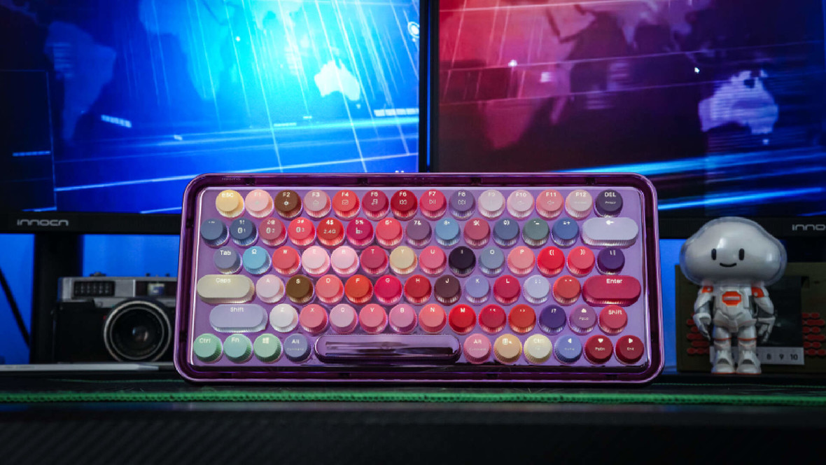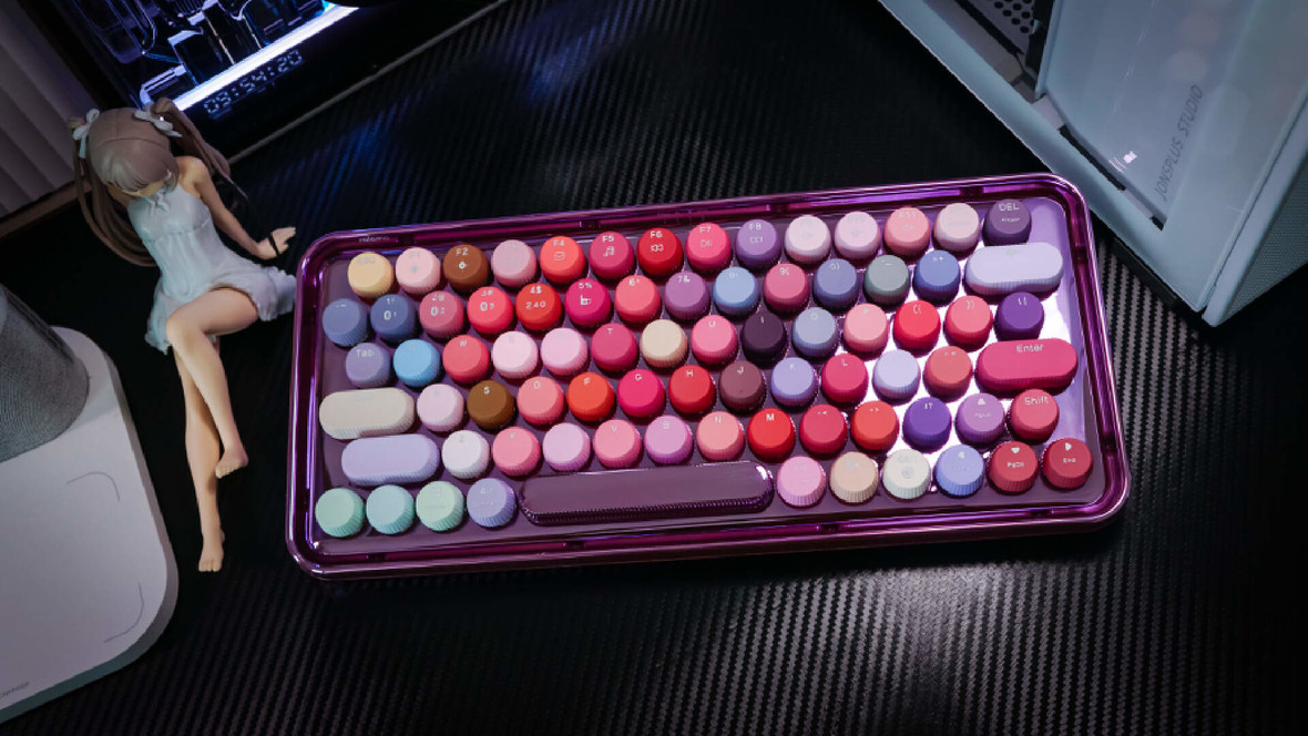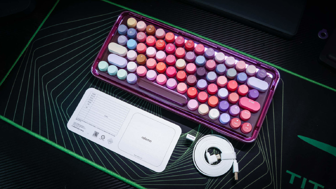 这款雷柏ralemo Pre5(彩妆紫)整体是电镀紫色的底盘,金属光泽让人眼前一亮。上面的键帽由79个不同颜色组成,姹紫嫣红的确实很好看。