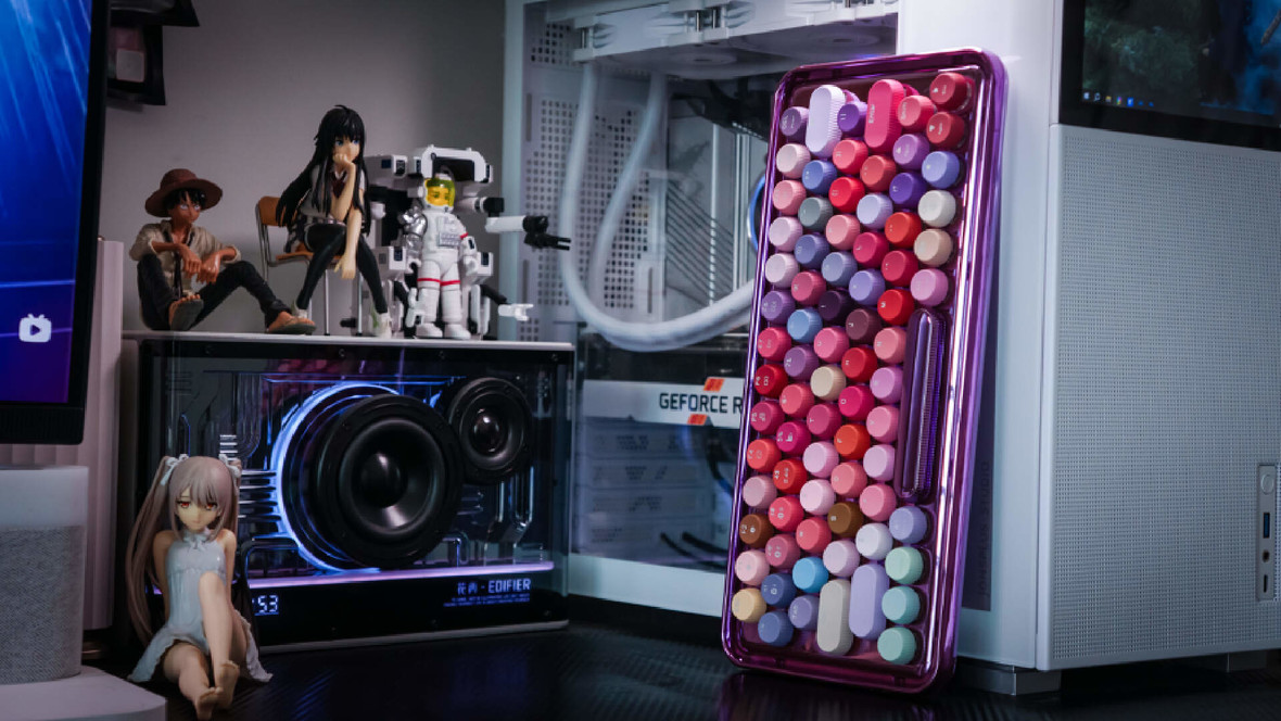 79个不同色号的键帽采用少见的圆形百褶设计,肤感材质触摸舒适,键帽上丝印清晰。像不像彩妆盘我没有发言权,我看着很像一盘子酒瓶盖,满可爱的。
